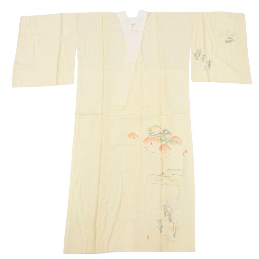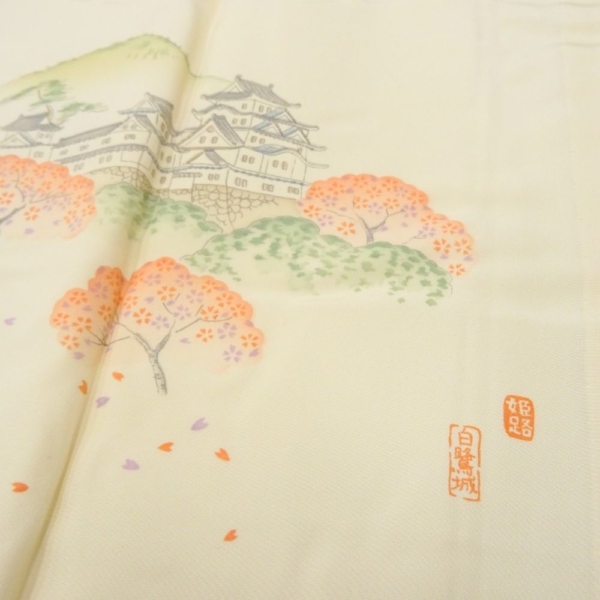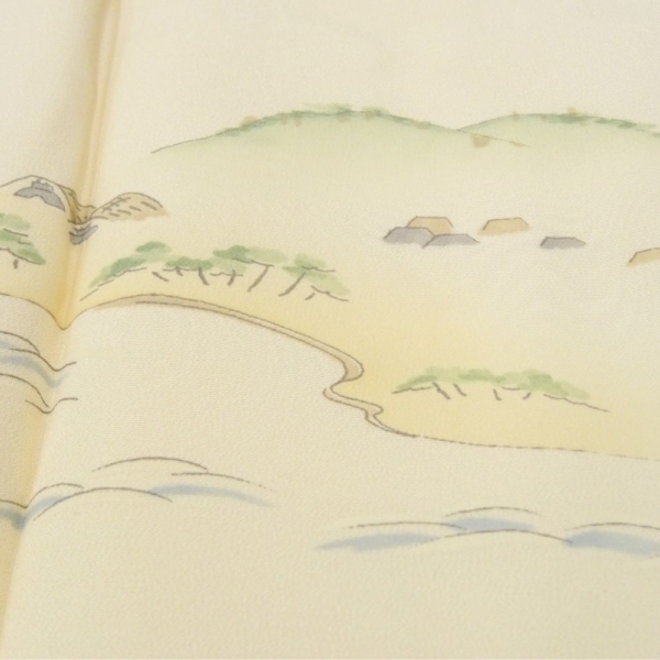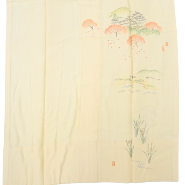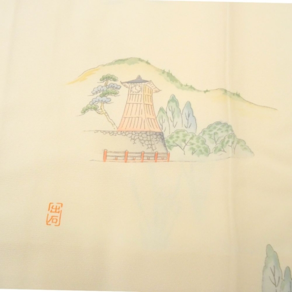 長襦袢 正絹 リユース 中古 礼装用 絵羽付 象牙色 健勝苑 辰鼓楼・城風景文様 k12-018-3 半衿付き