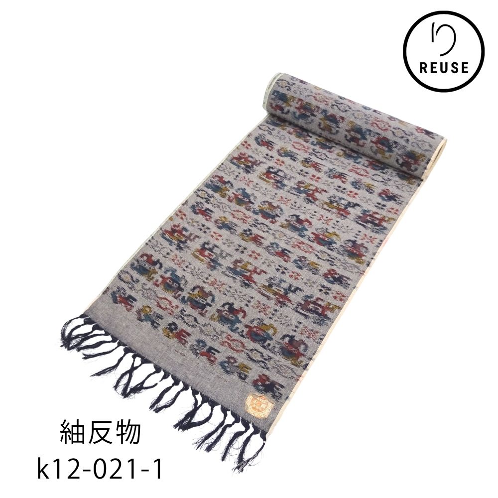十日町絣反物 リユース グレー 絣模様 エキゾチック 幾何学 k12-021-1 (8050-00980) 未仕立て カジュアル 街着 洒落着 ハンドメイド素材