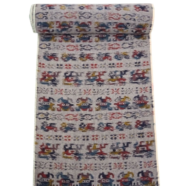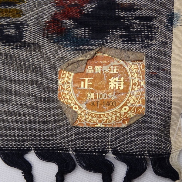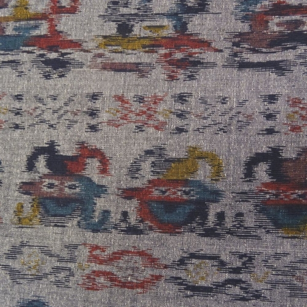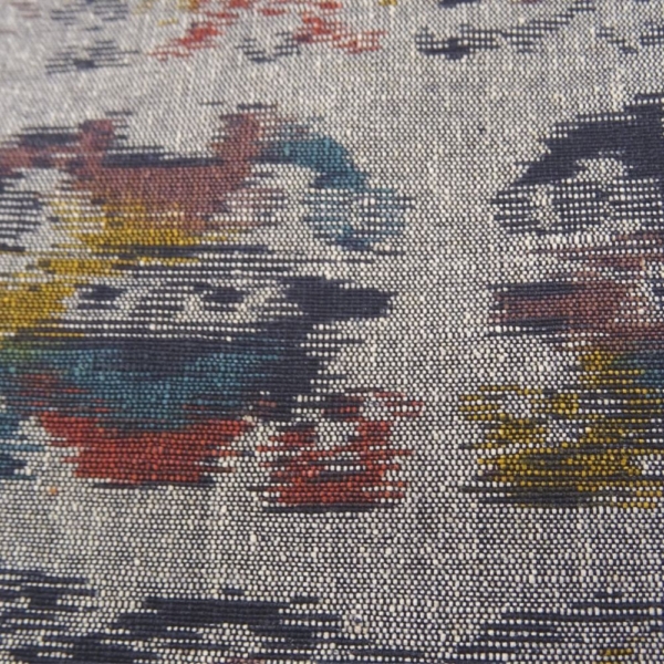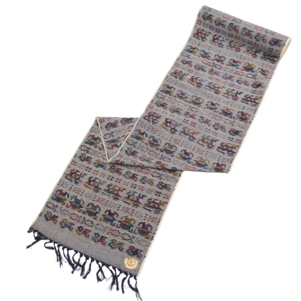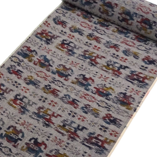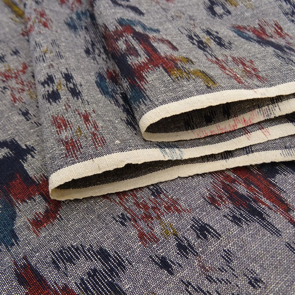 落ち着いたグレーの地色に、赤、青、黄色などの鮮やかな色彩で織り出された絣模様が、都会的で洗練された印象を与えます。