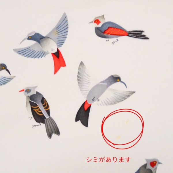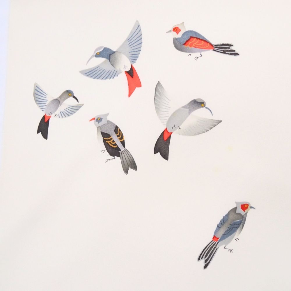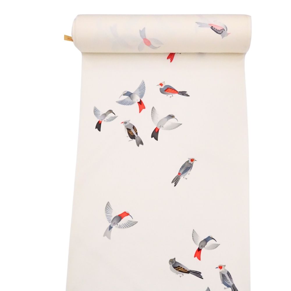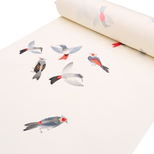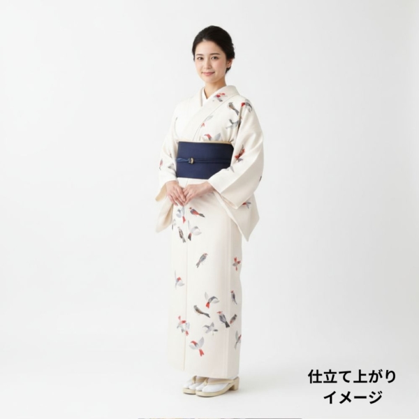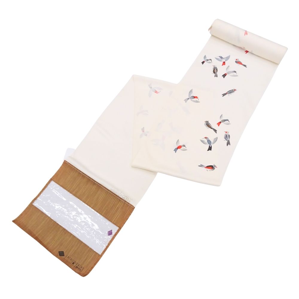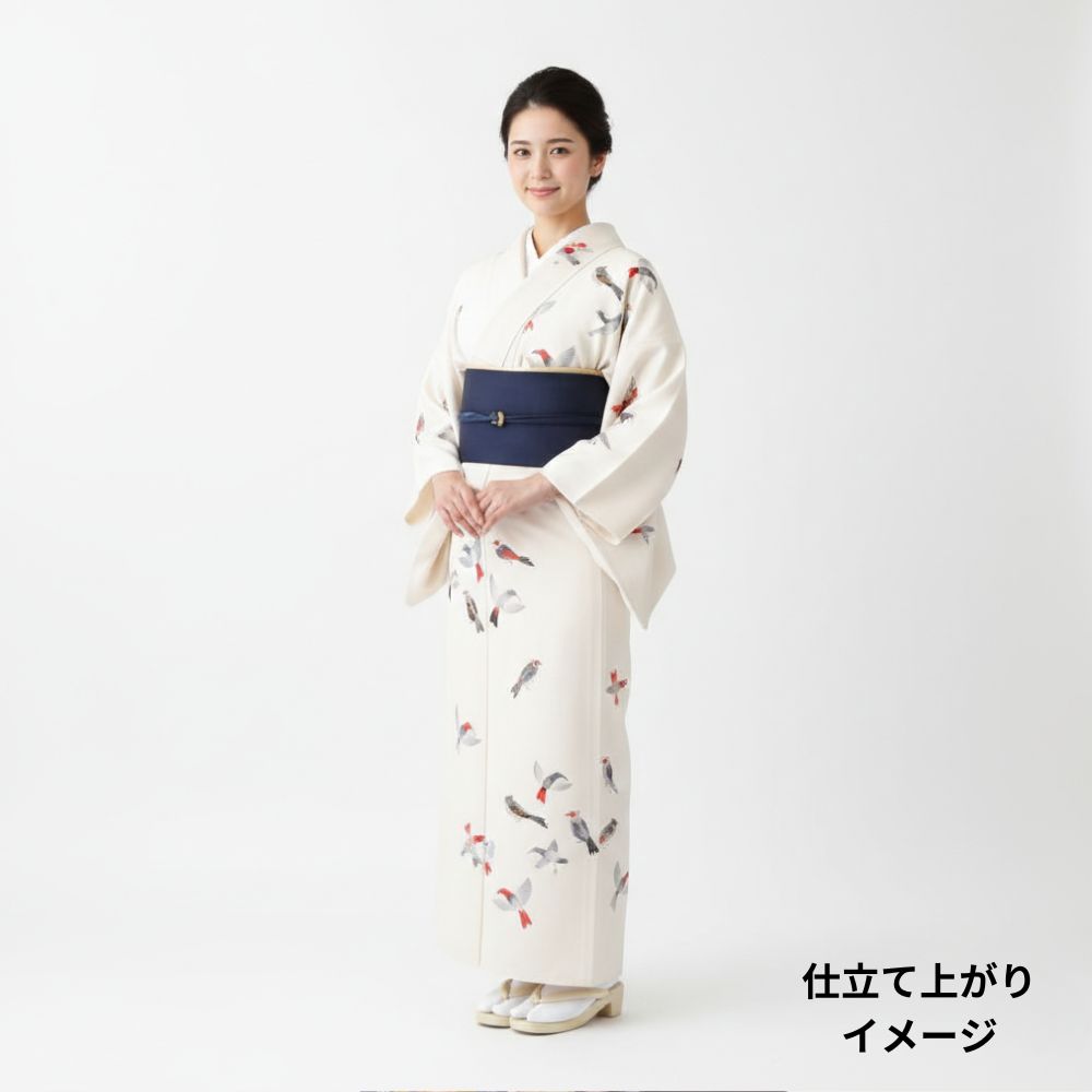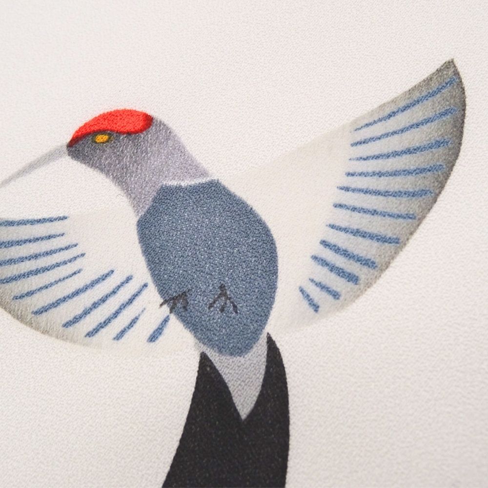 写実的すぎないモダンなタッチで描かれた小鳥が、着姿にリズムと物語性を与えてくれます。