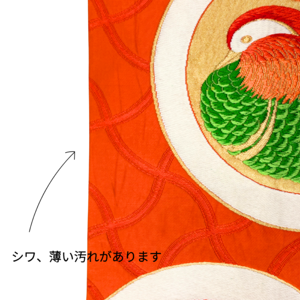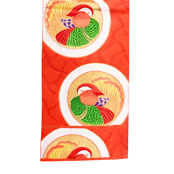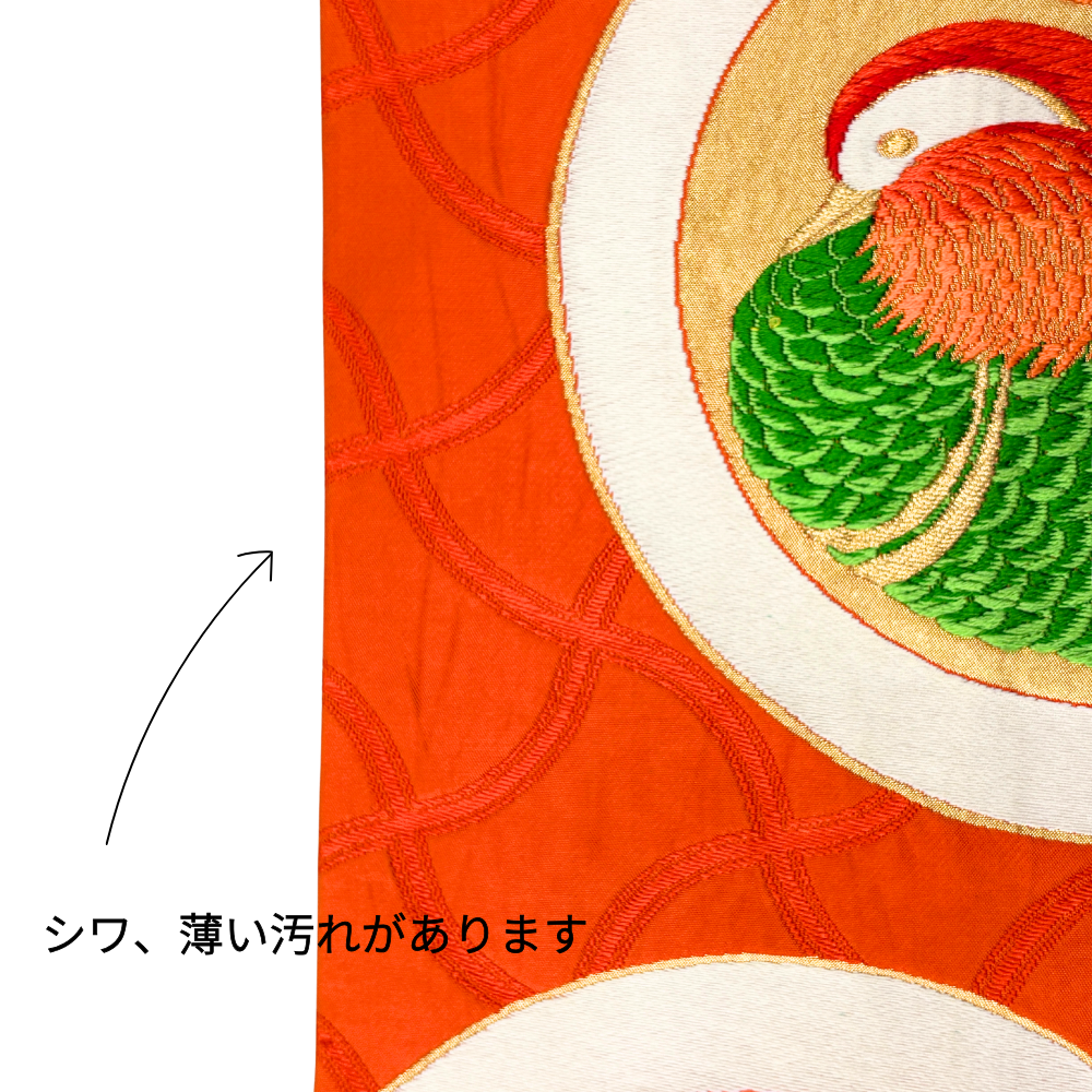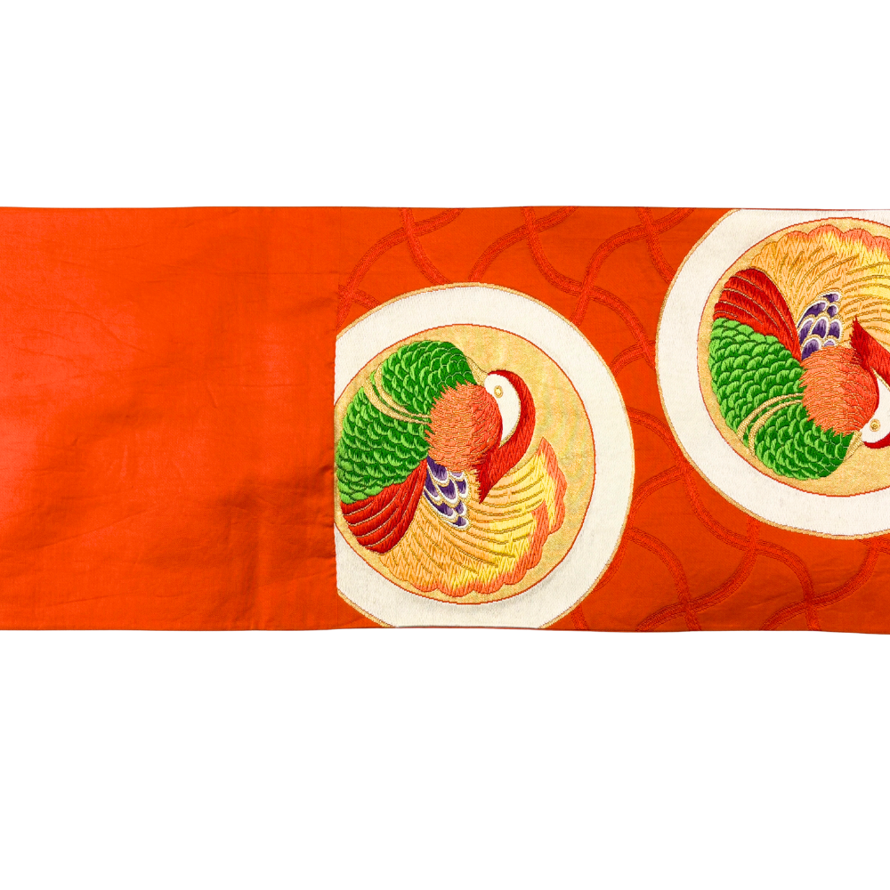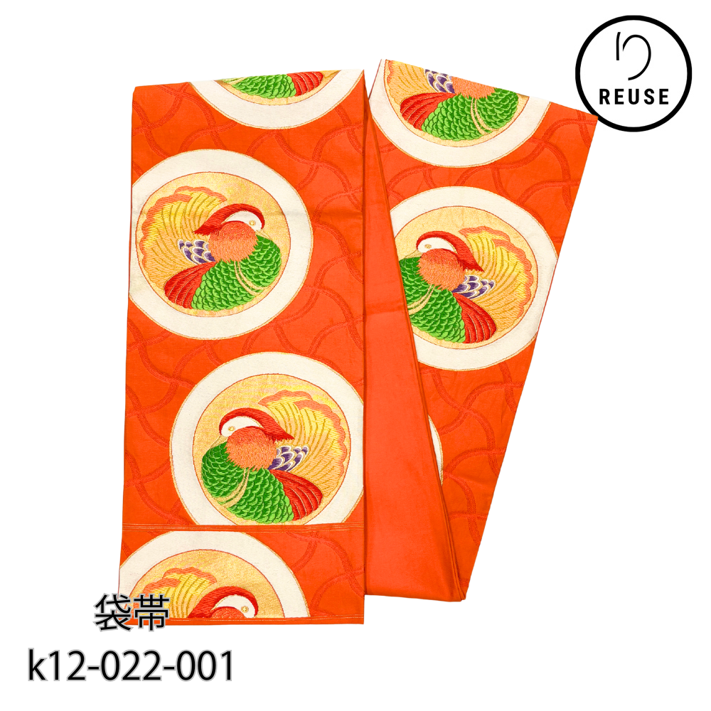 袋帯 正絹 リユース 朱色 おしどり 鴛鴦 丸紋 刺繍 六通 振袖 成人式 礼装用 k12-022-001