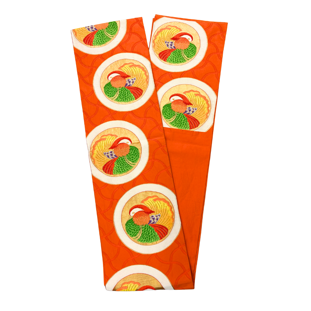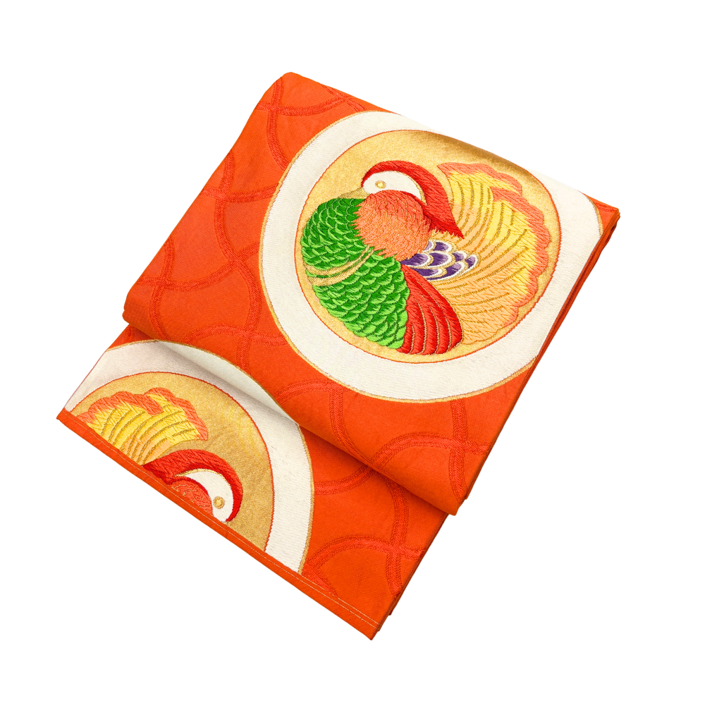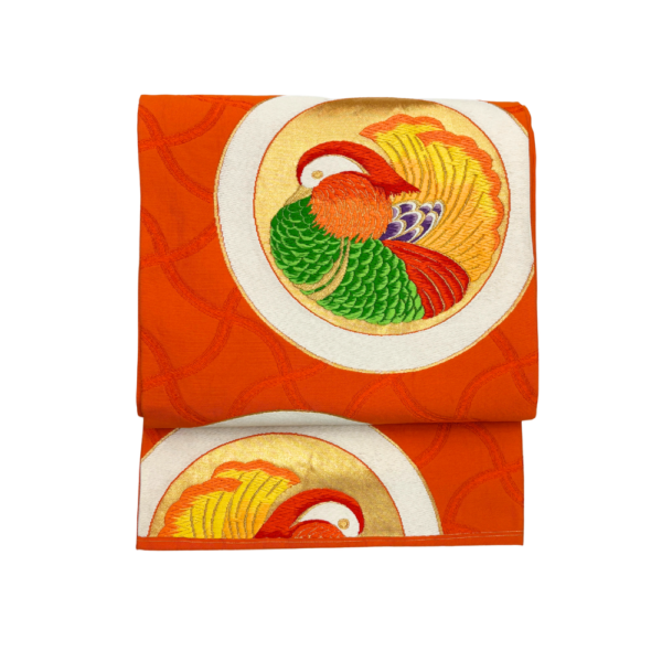 鮮やかな朱色の地に、仲睦まじい「おしどり(鴛鴦)」の丸紋が贅沢に刺繍された袋帯です。