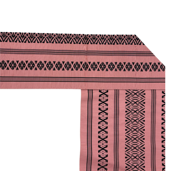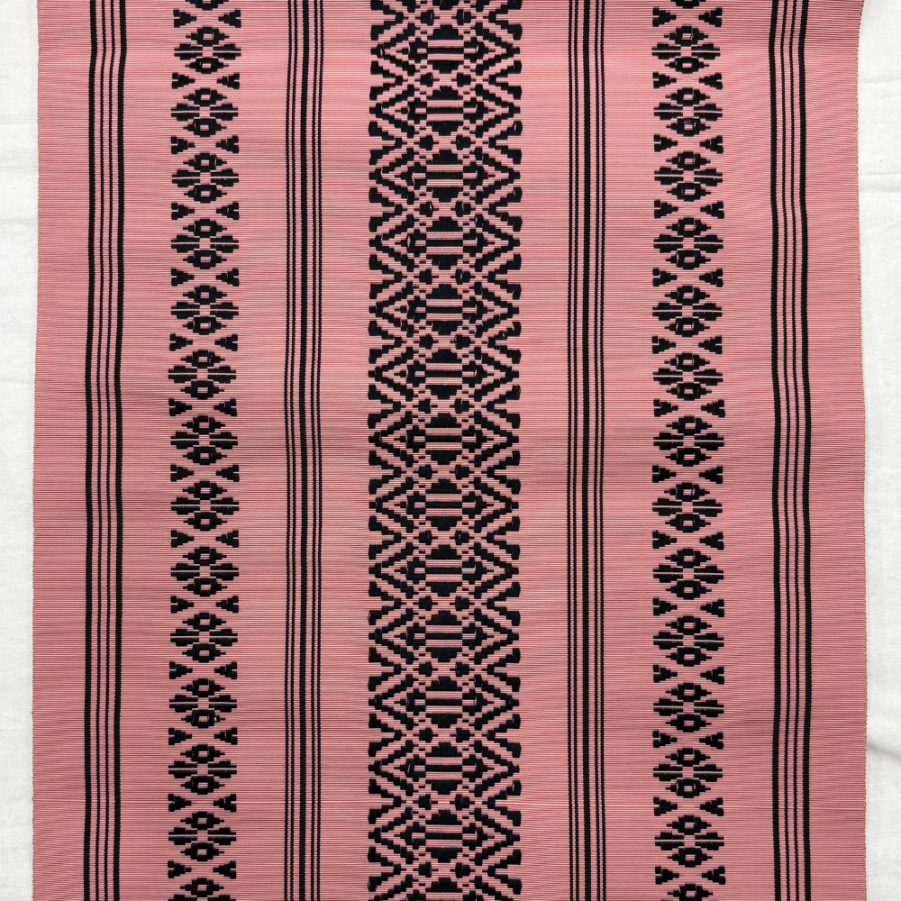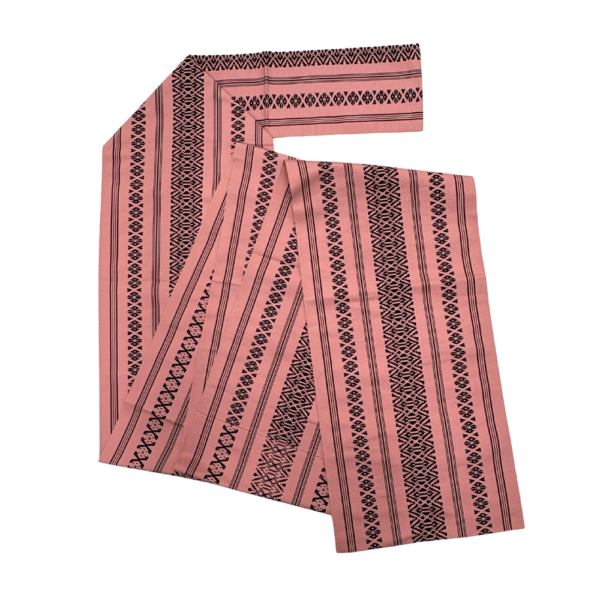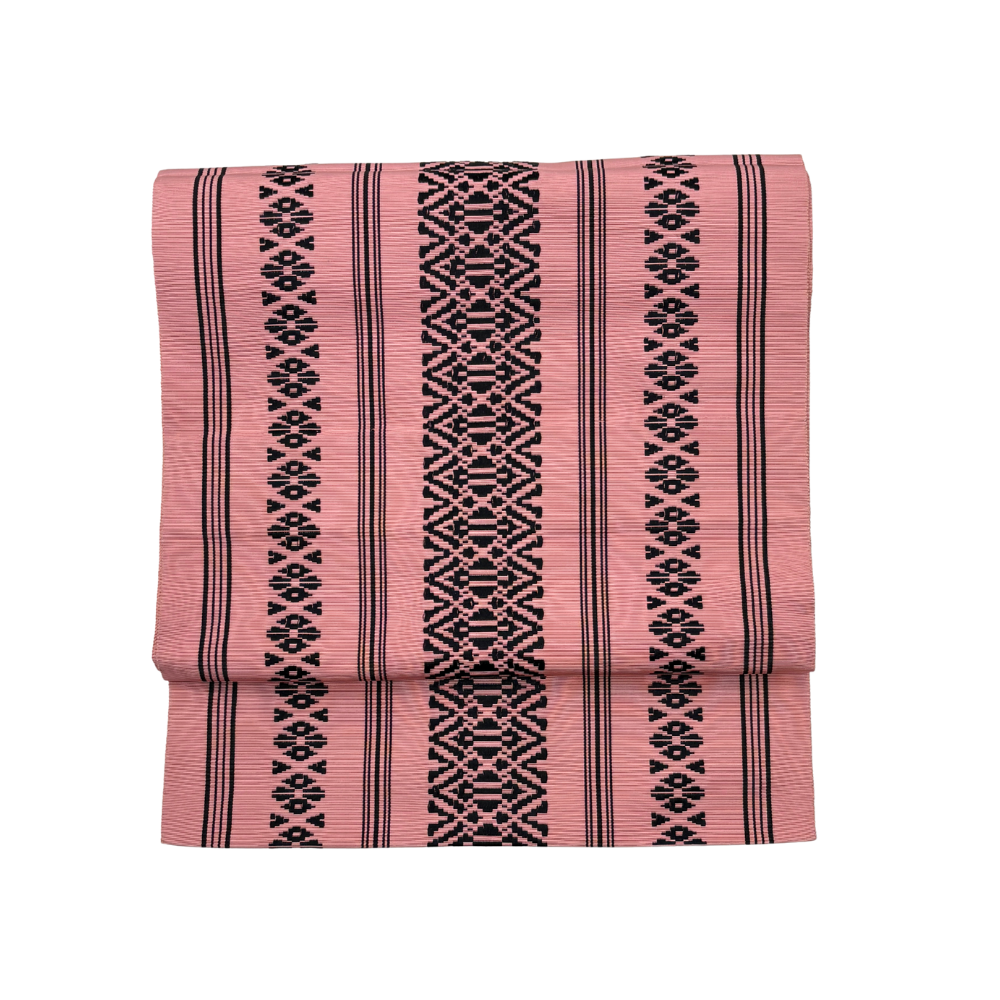 落ち着いたピンクの地色に、凛とした黒の模様が引き立つ、可愛らしさと粋な雰囲気を併せ持った「献上柄」の名古屋帯です。