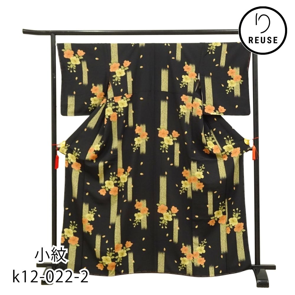 小紋 正絹 リユース 中古 黒地 橘に霞文様 k12-022-2 普段着 お稽古 お出かけ カジュアル