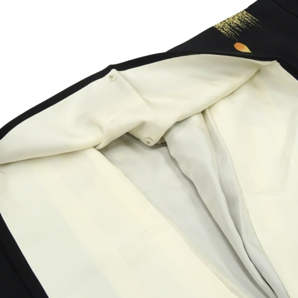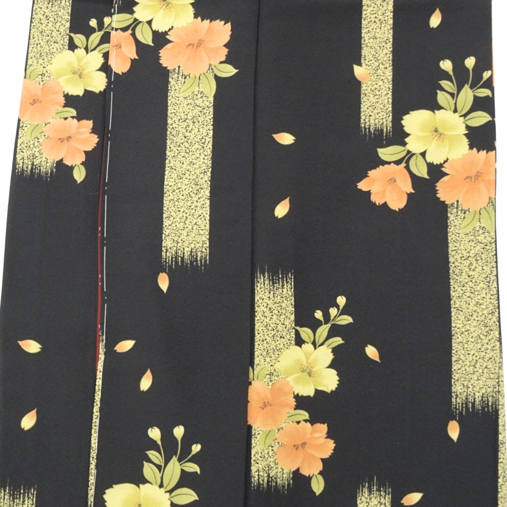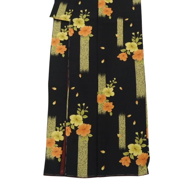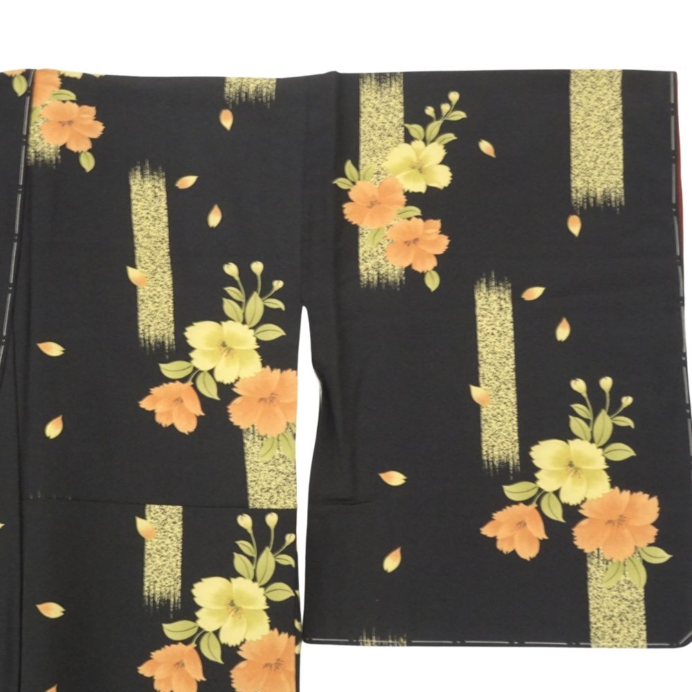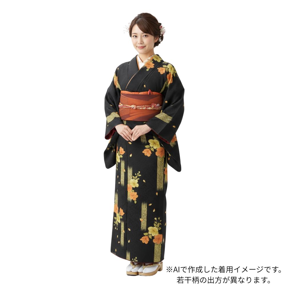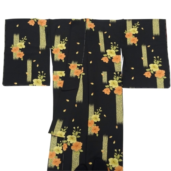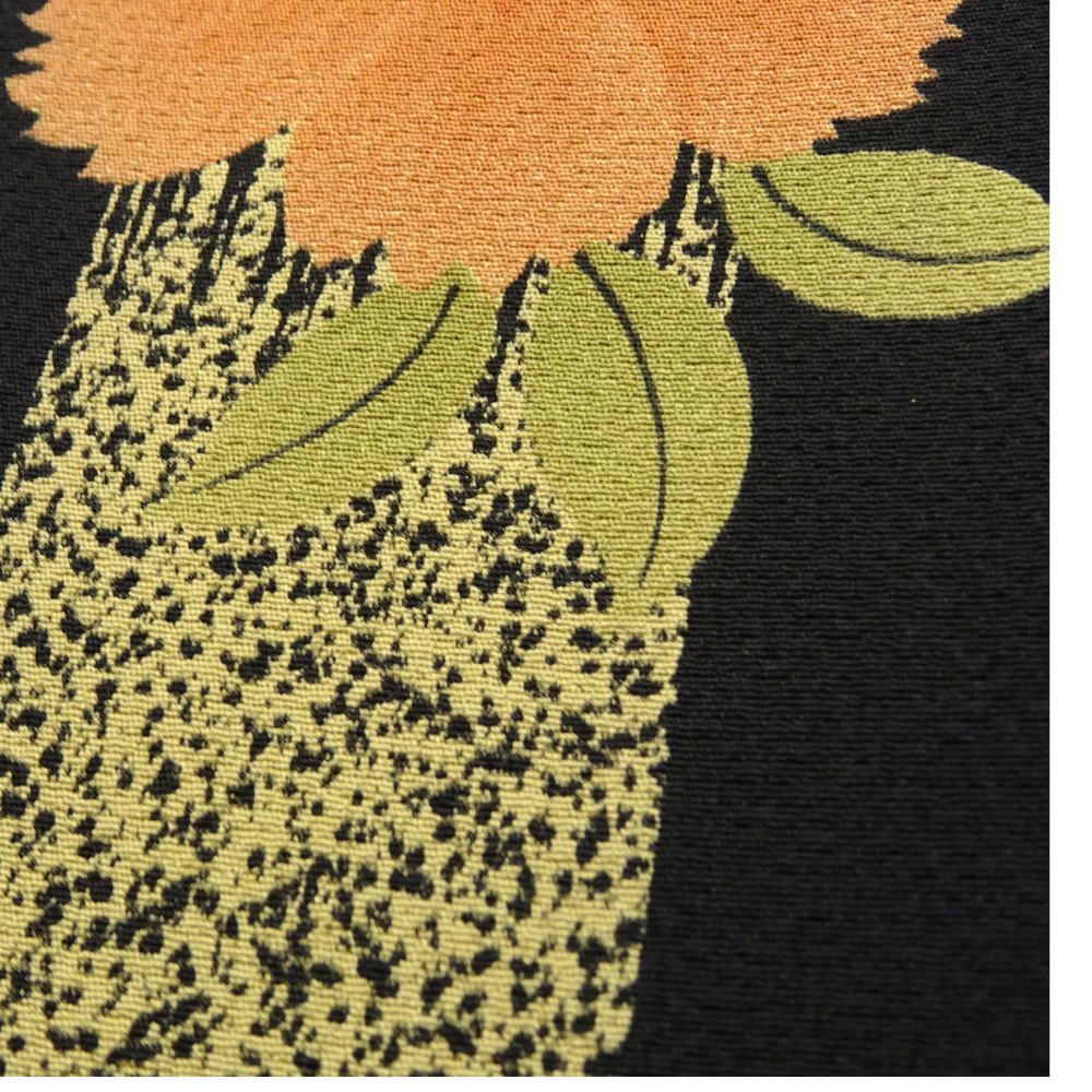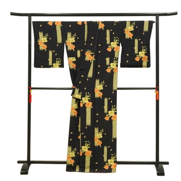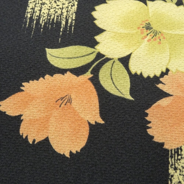 凛とした黒地に、オレンジや黄色の鮮やかな橘の花が映える、粋でモダンな雰囲気の小紋です。