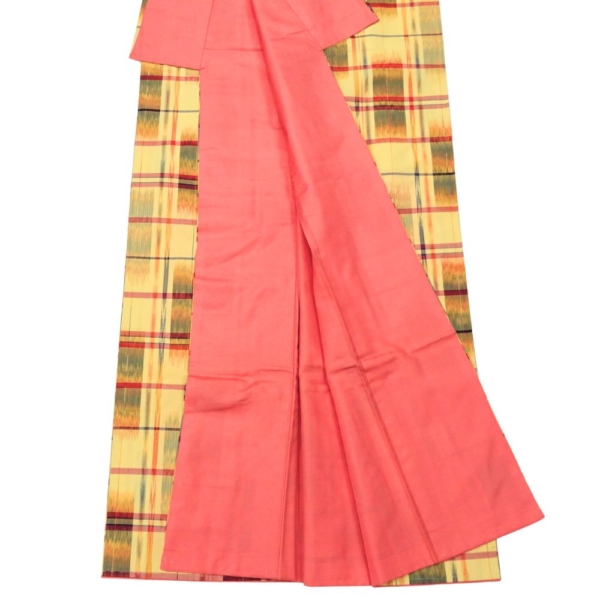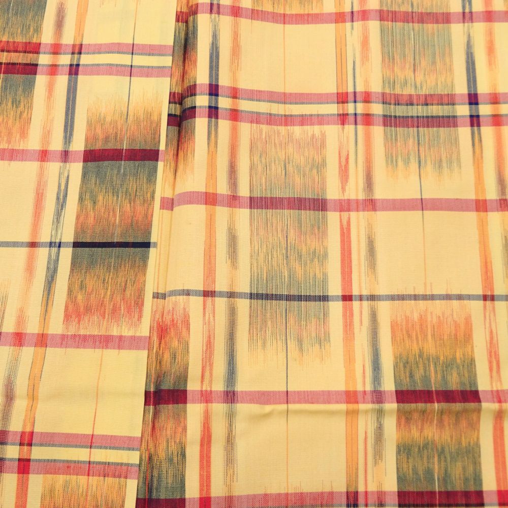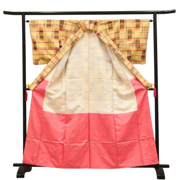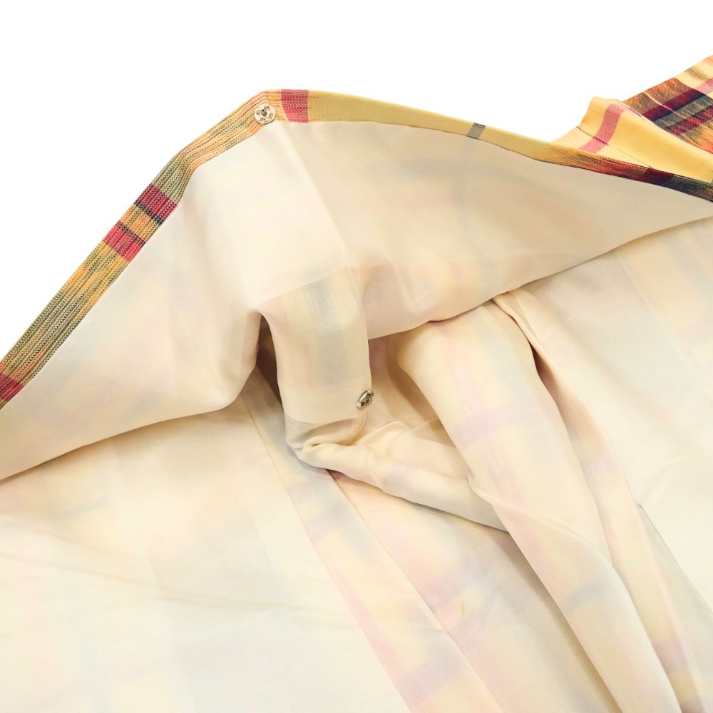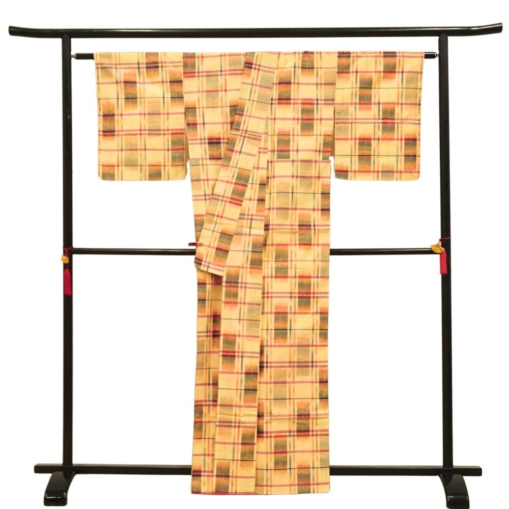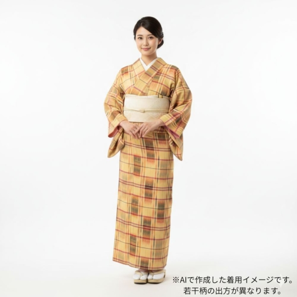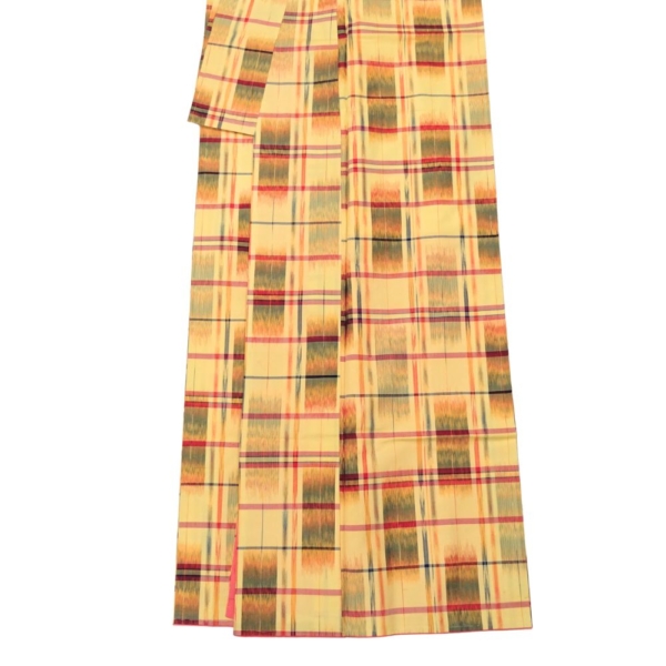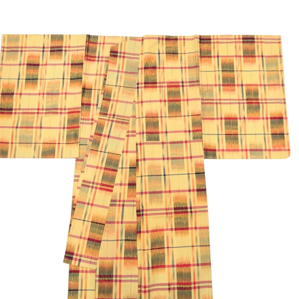 紬 正絹 リユース 中古 黄色 格子 チェック 絣 k12-023-3 普段着 お稽古 お出かけ カジュアル