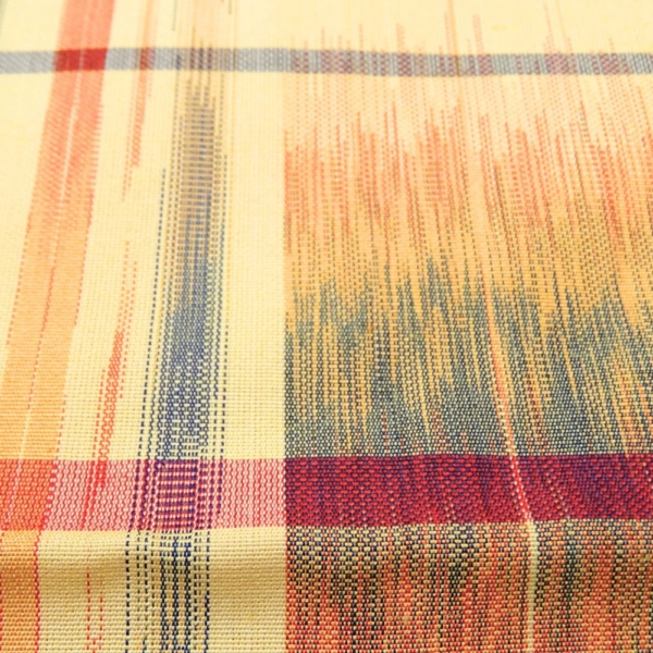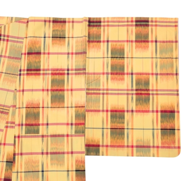 温かみのある黄色地に、赤、深緑、濃紺のラインが交差する大きな格子柄。
