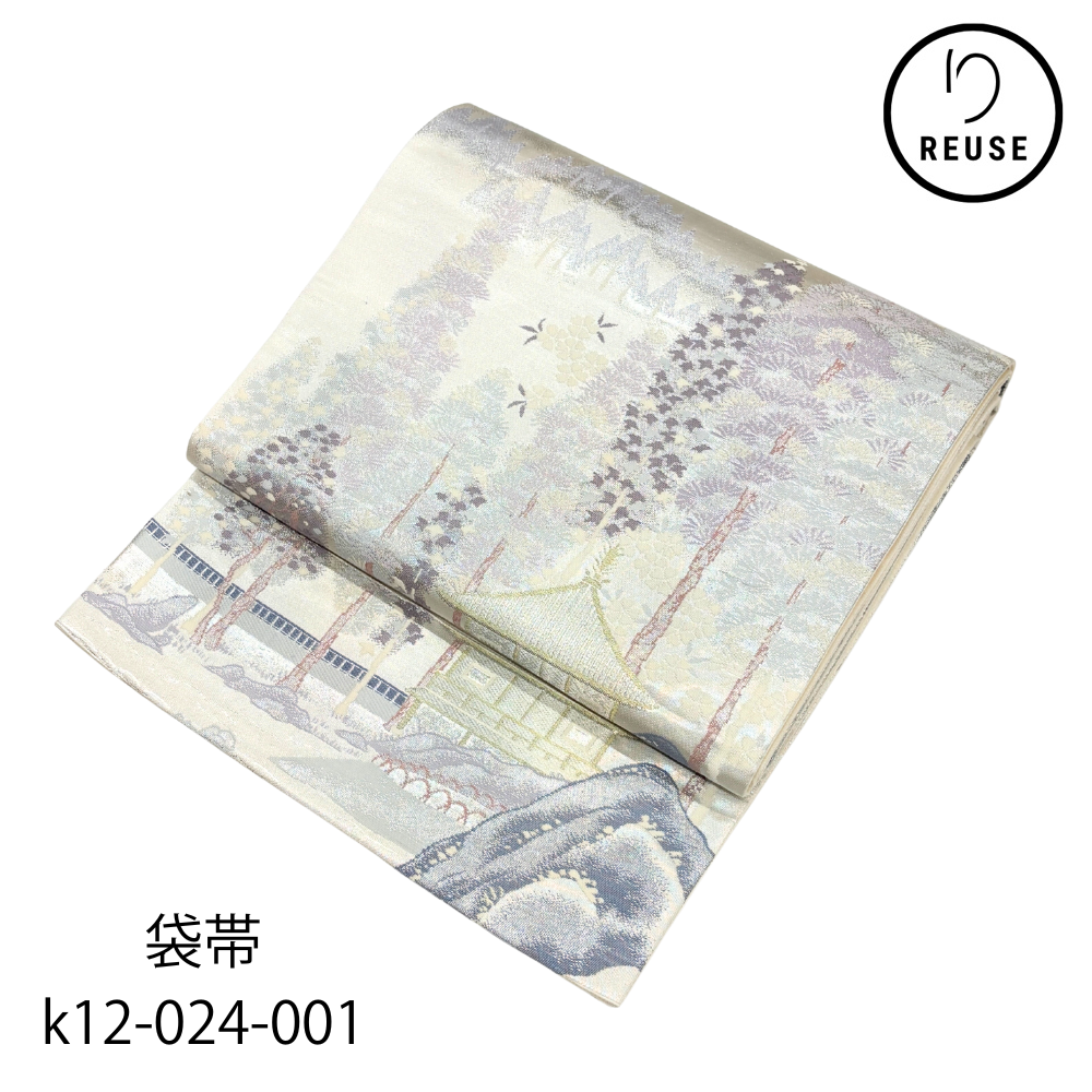 袋帯 六通柄 正絹 リユース 中古 銀地 山水風景文様 遠山に松 k12-024-001