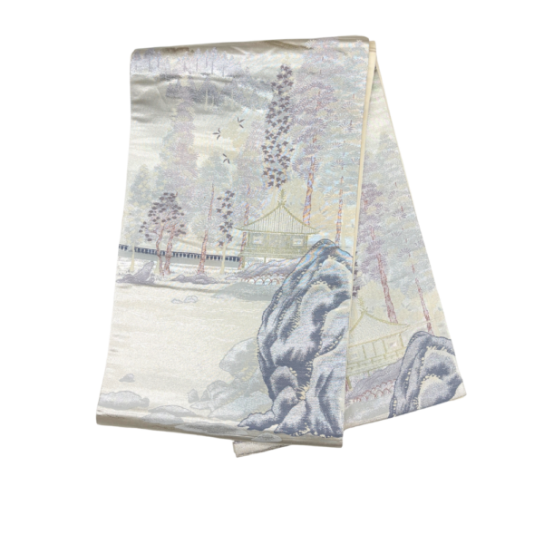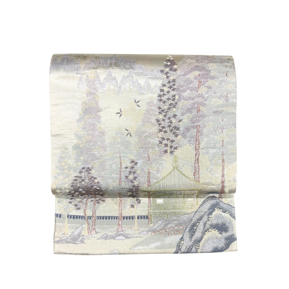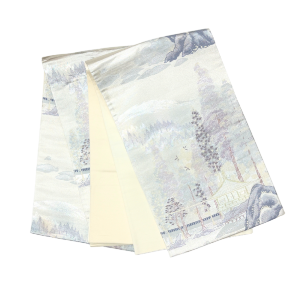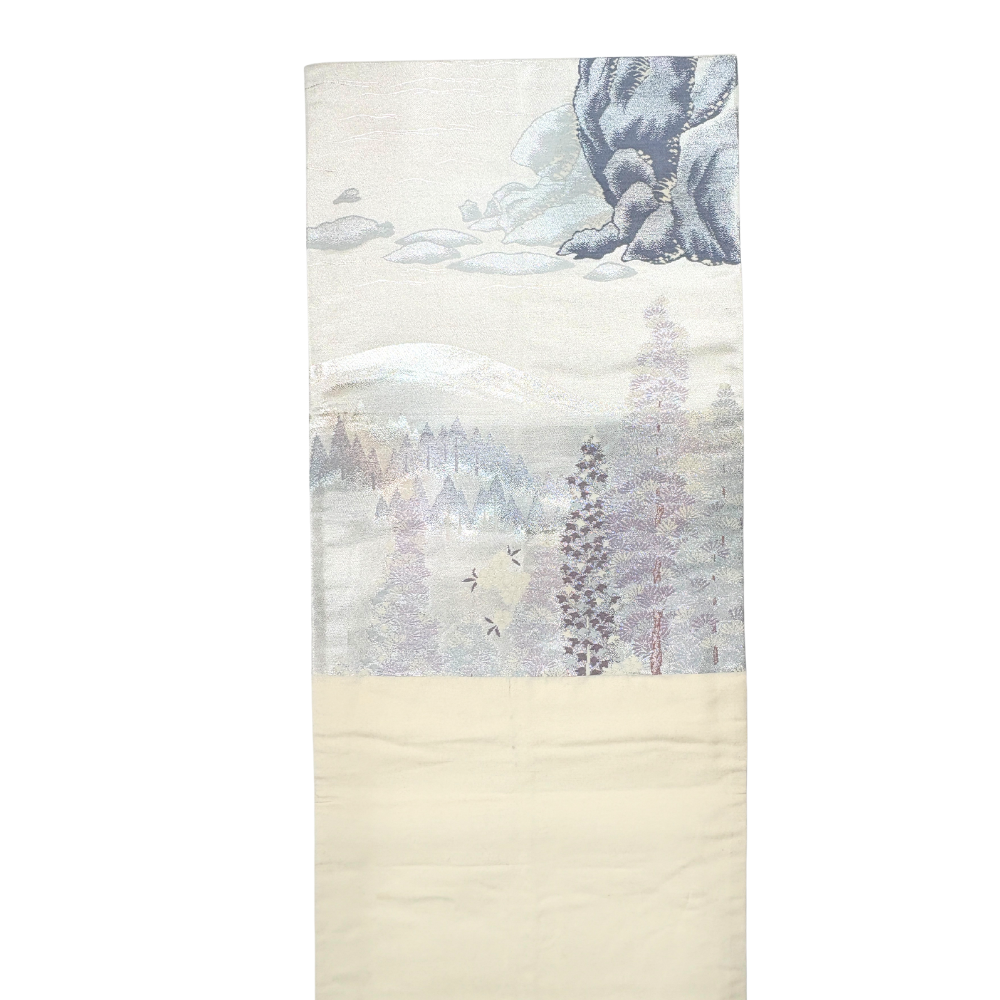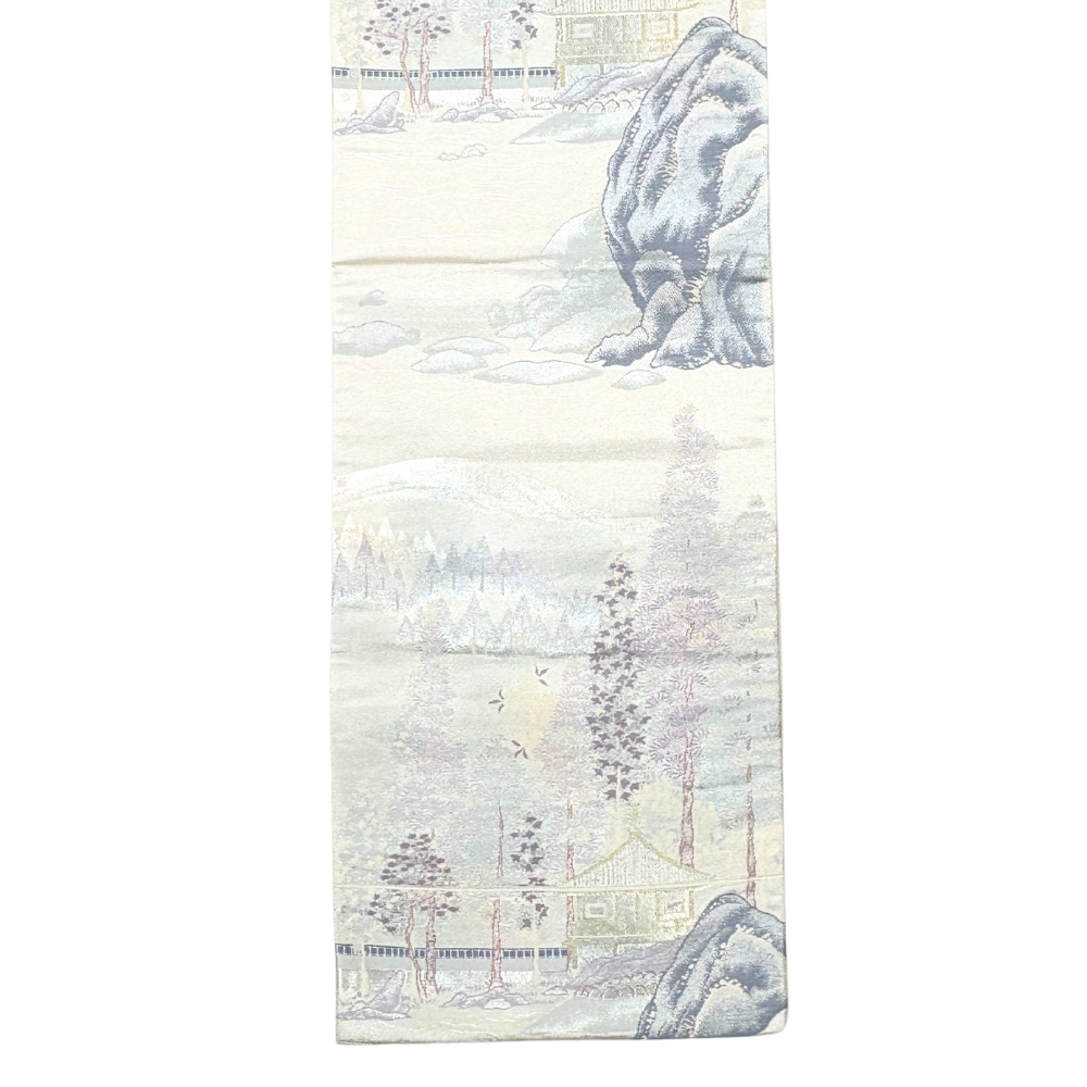 霞がかった静かな山水の風景を、繊細な織り技術で表現した非常に気品あふれる袋帯です。