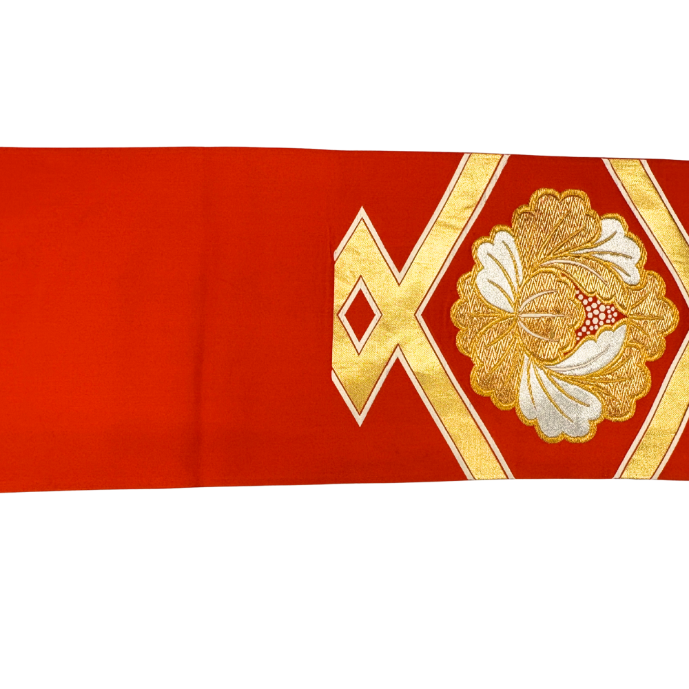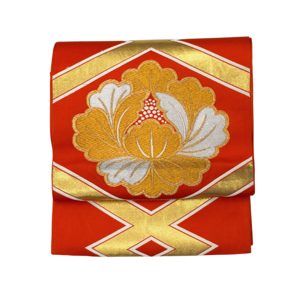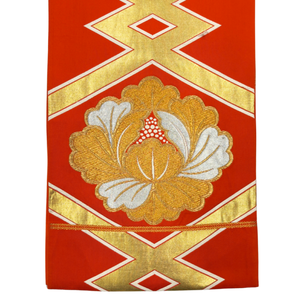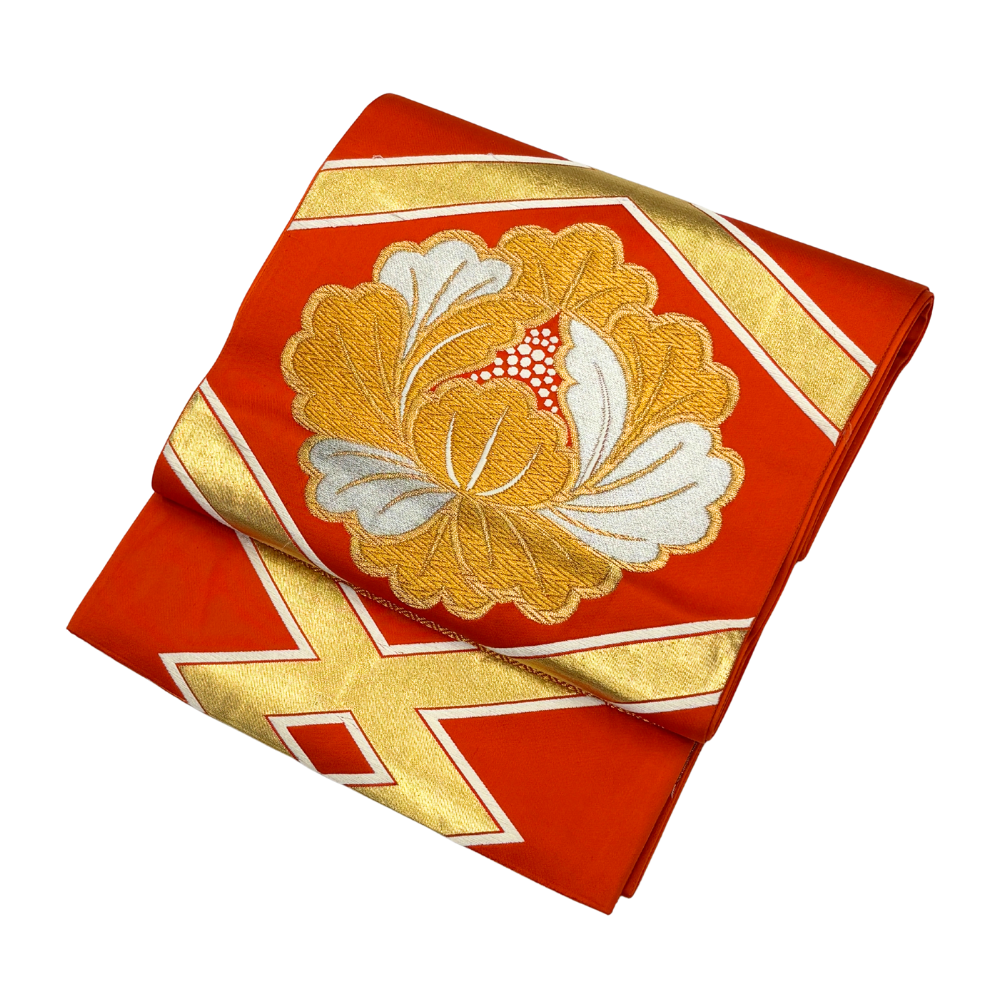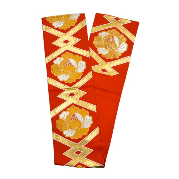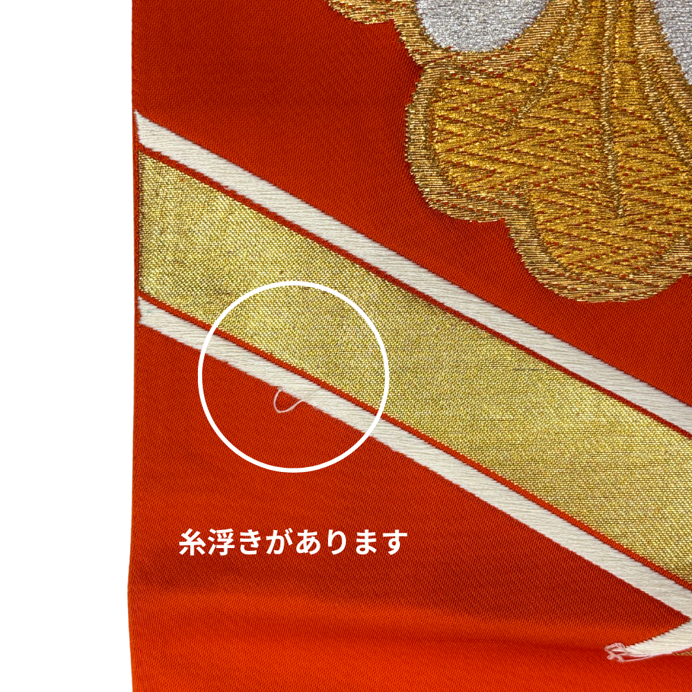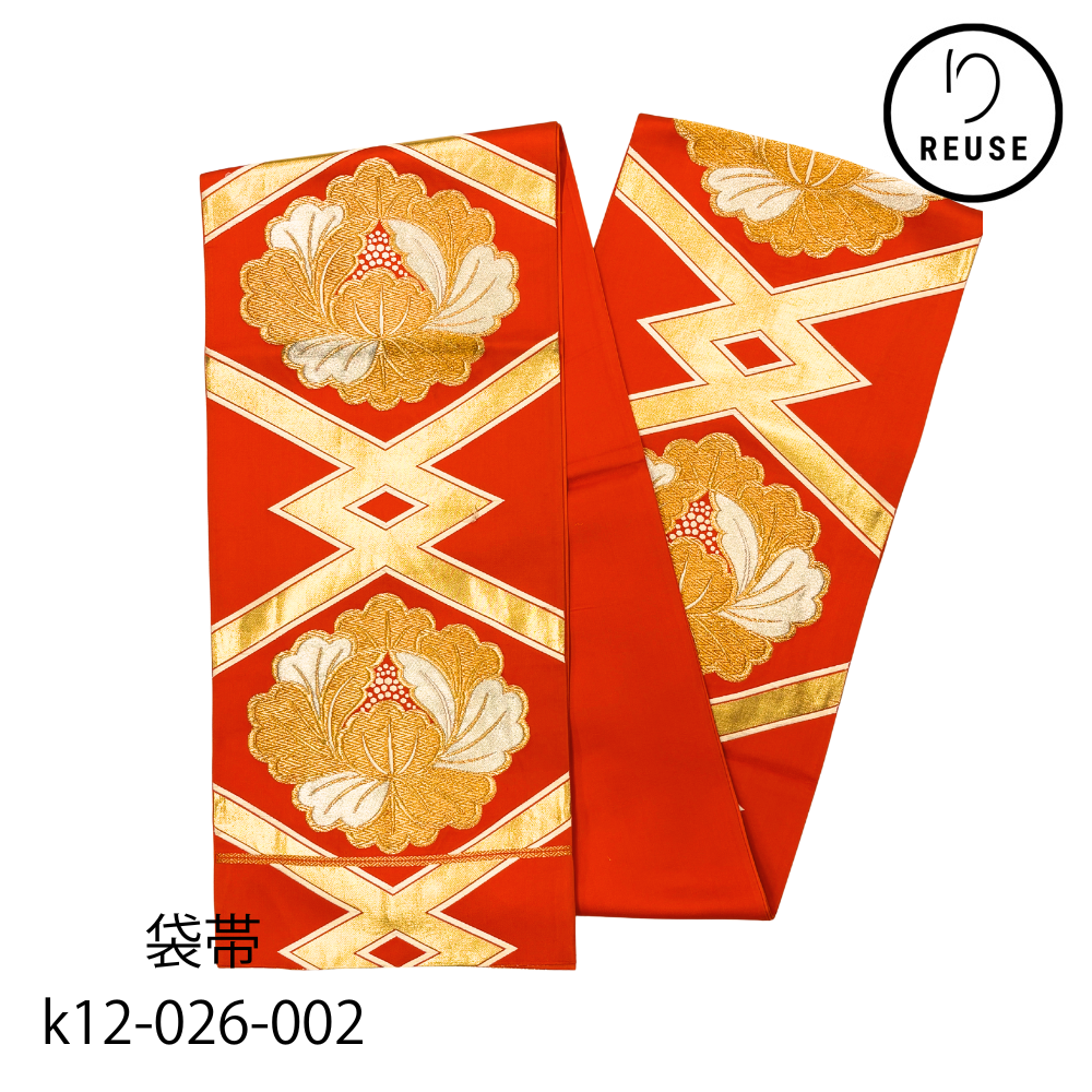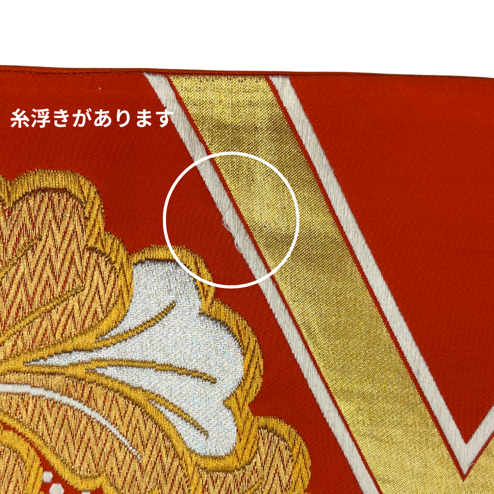 袋帯 正絹 リユース 六通柄 朱赤 金糸 菱に大牡丹紋 振袖 成人式 結婚式 k12-026-002