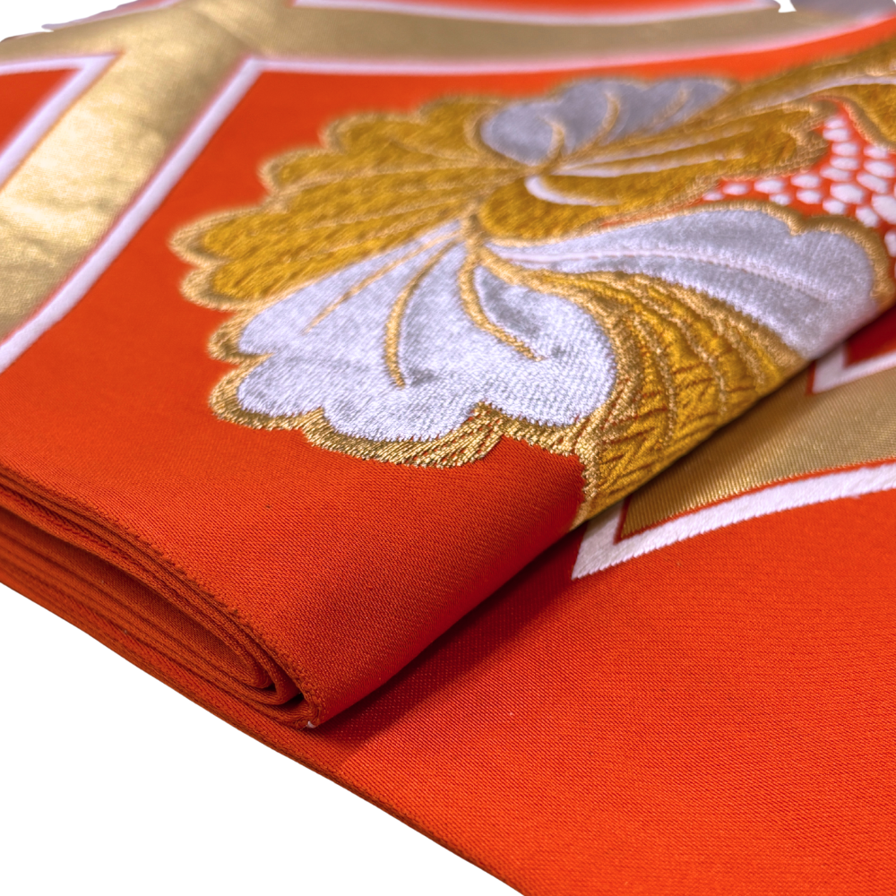 伝統的な吉祥文様が大胆な構図で配されており、振袖の胸元や帯結びをパッと明るく、豪華に彩ります。