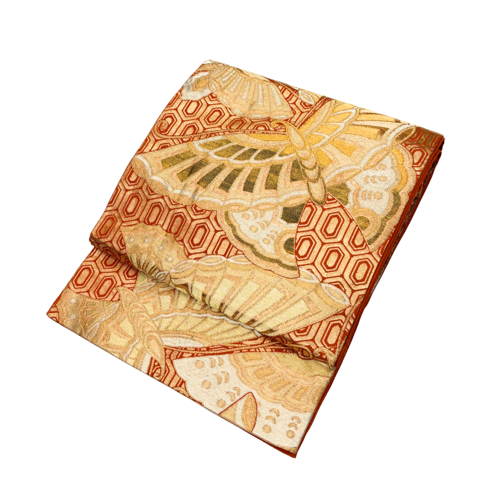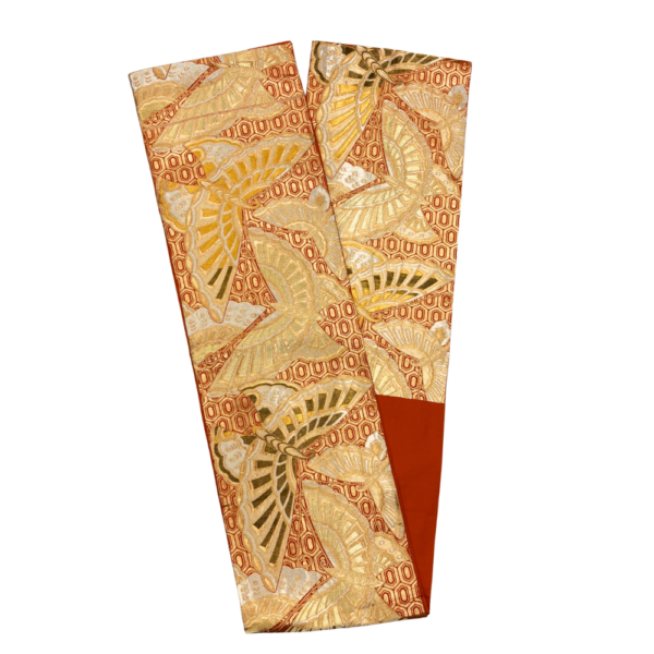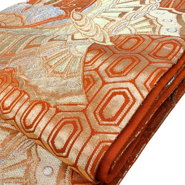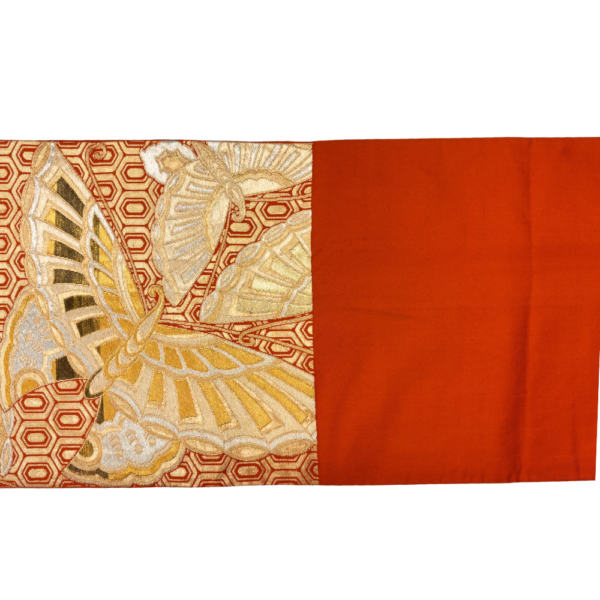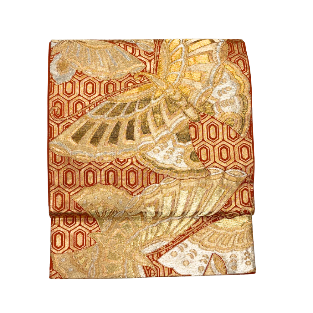 鮮やかな朱色の地に、吉祥文様である「亀甲」と、優雅に舞う「蝶」を贅沢な金銀糸で織り出した袋帯です。
