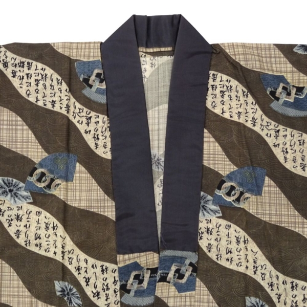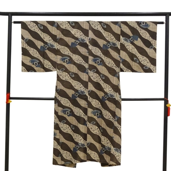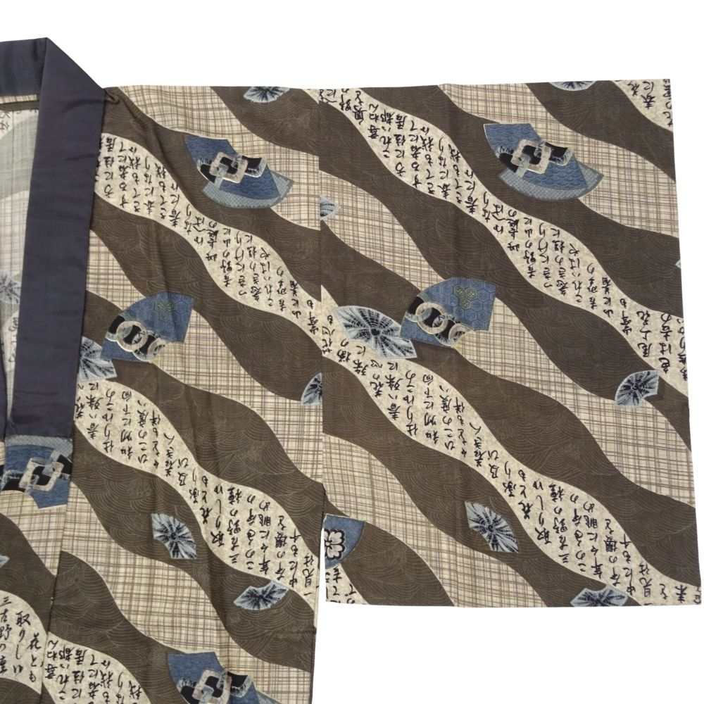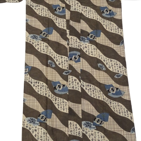 男性モス長襦袢 リユース 中古 茶色地 扇に字入り k12-026-4 古典柄 アンティーク調 和装 着物