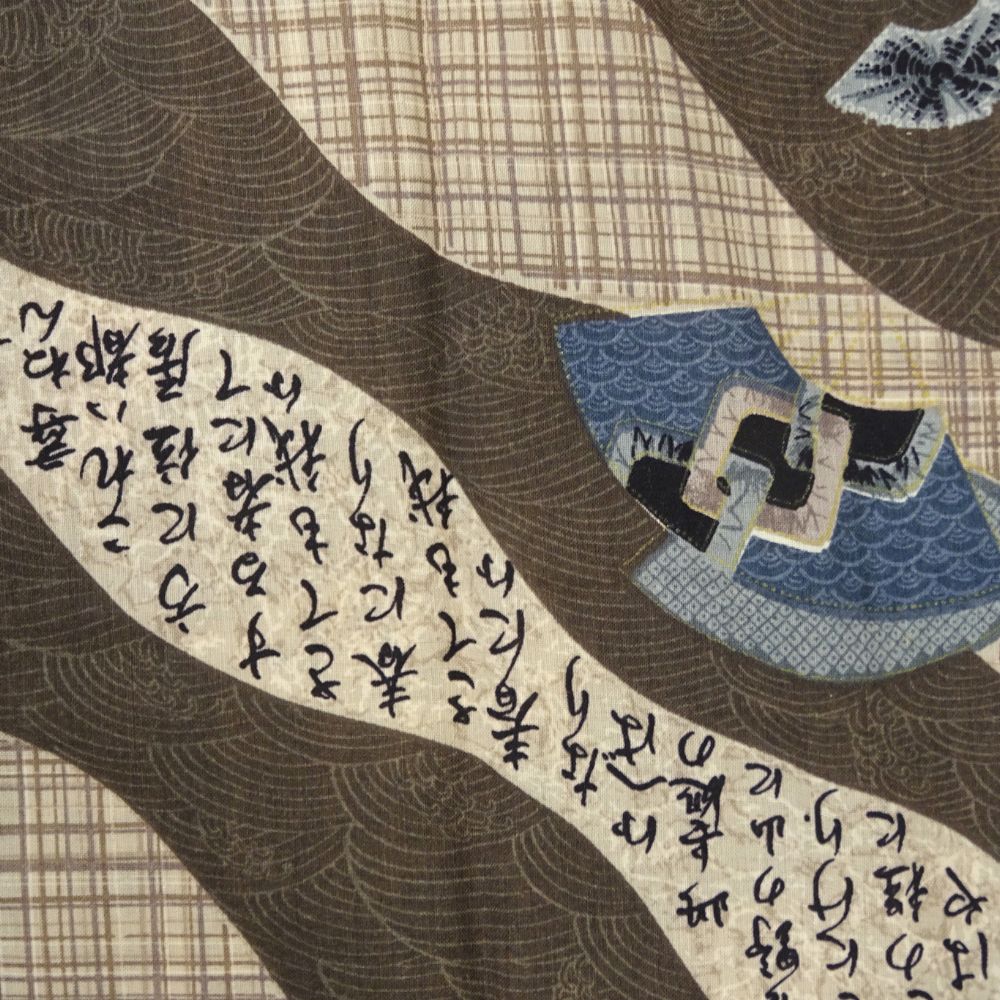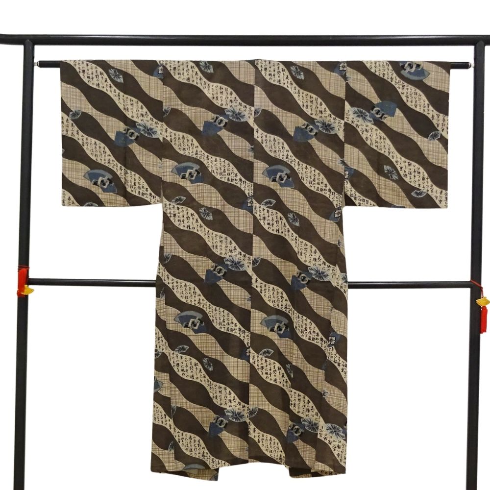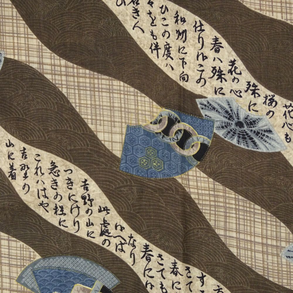 ブラウンを基調としたチェック柄の地に、動きのある流水模様と上品な扇面が描かれています。