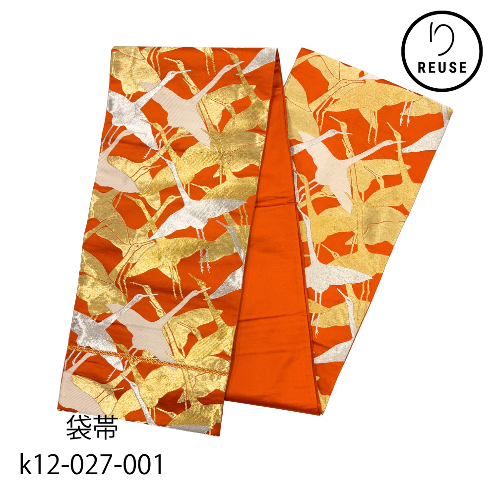 袋帯 正絹 リユース 中古 六通柄 飛鶴文様 金銀糸 朱色 橙色 振袖 訪問着 礼装用 k12-027-001