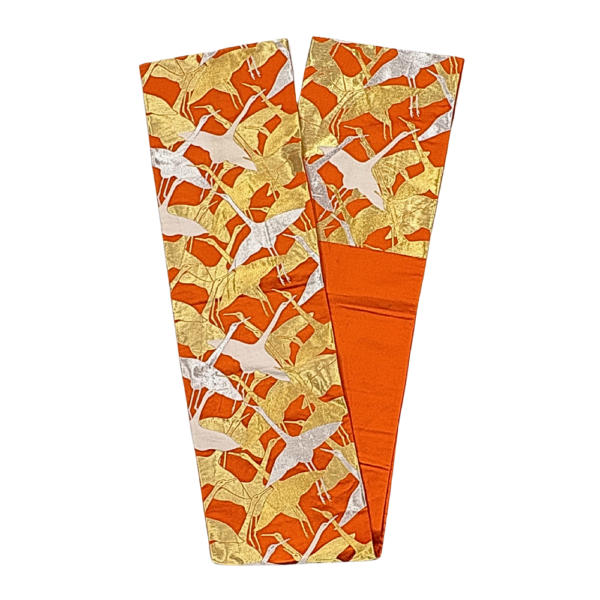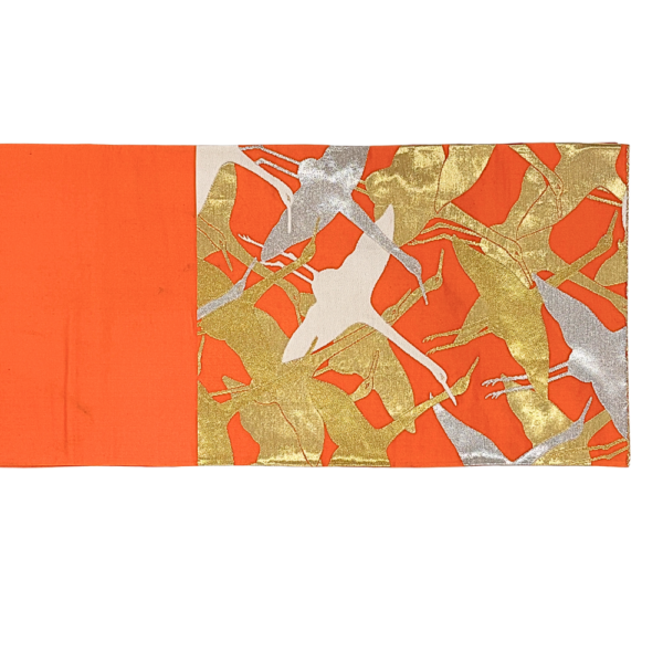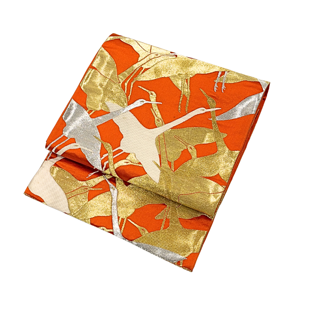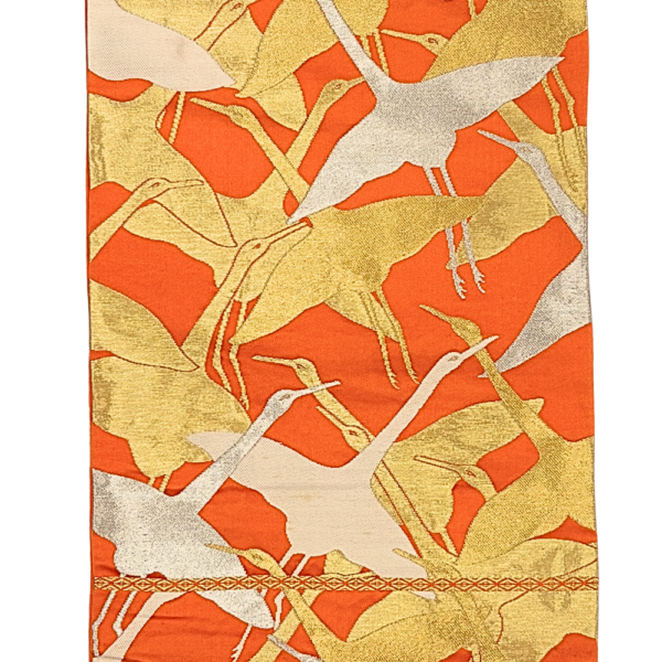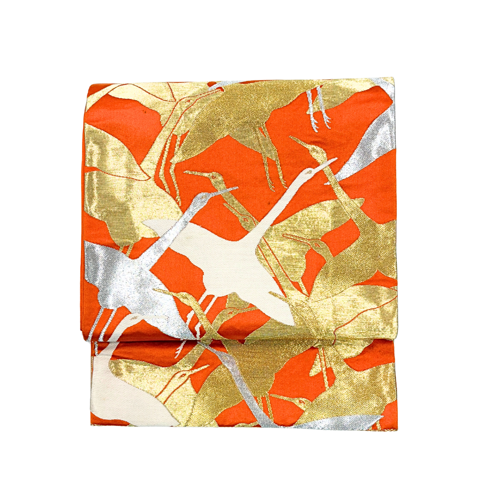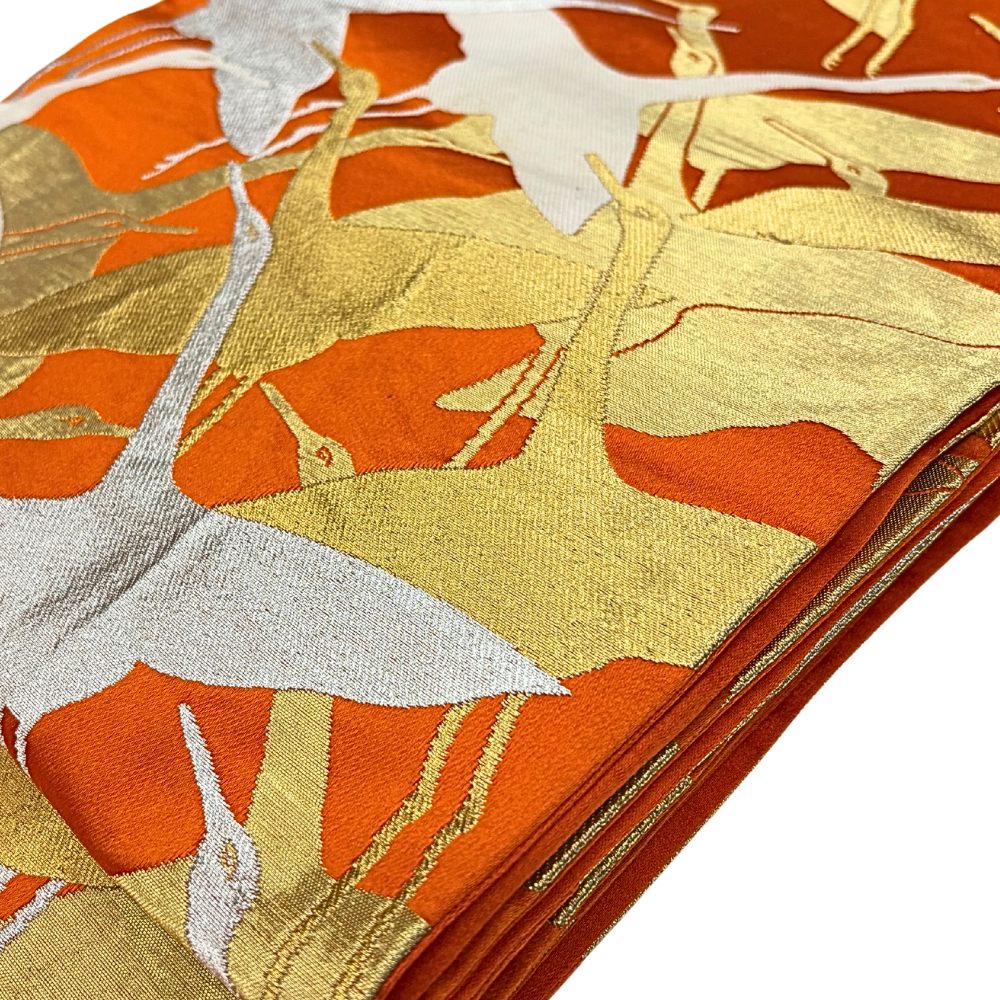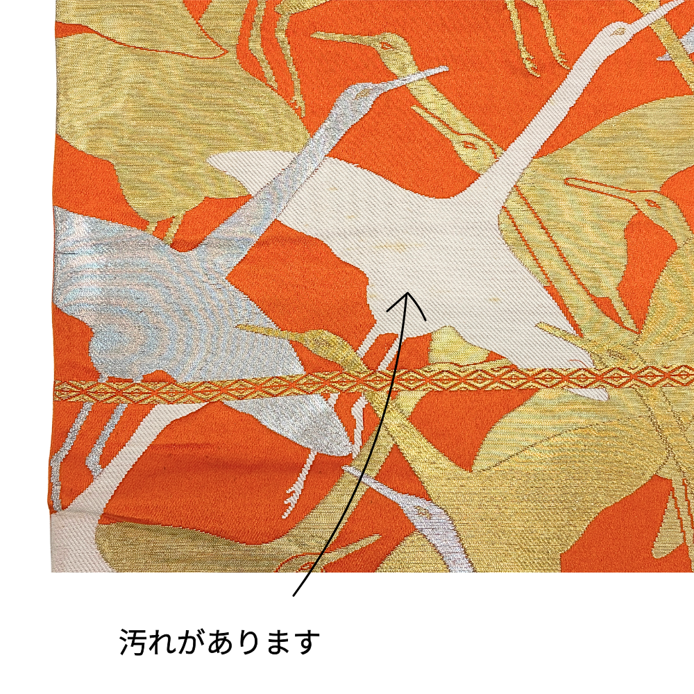 鮮やかな朱色の地に、躍動感あふれる飛鶴が金糸・銀糸で贅沢に織り込まれた、非常に格調高い袋帯です。