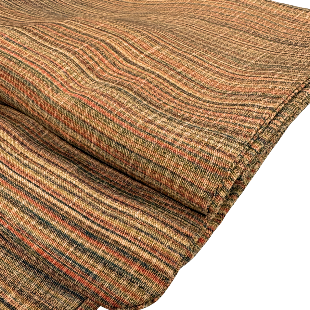 茶色、緑、赤、ベージュなどの多色使いで構成された横縞模様が、お洒落で落ち着いた雰囲気を演出します。