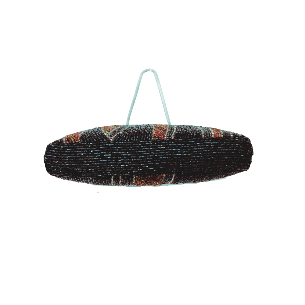 色とりどりのビーズで描かれた、波打つようなデザインが目を引くビーズバッグです。