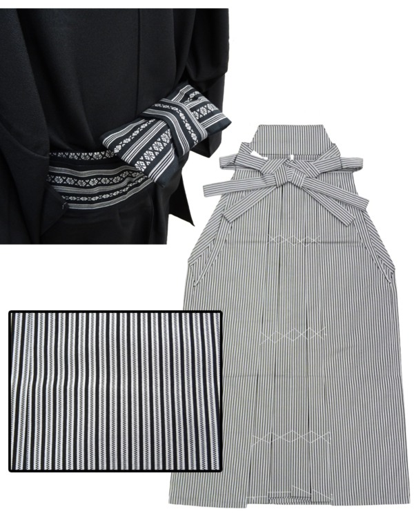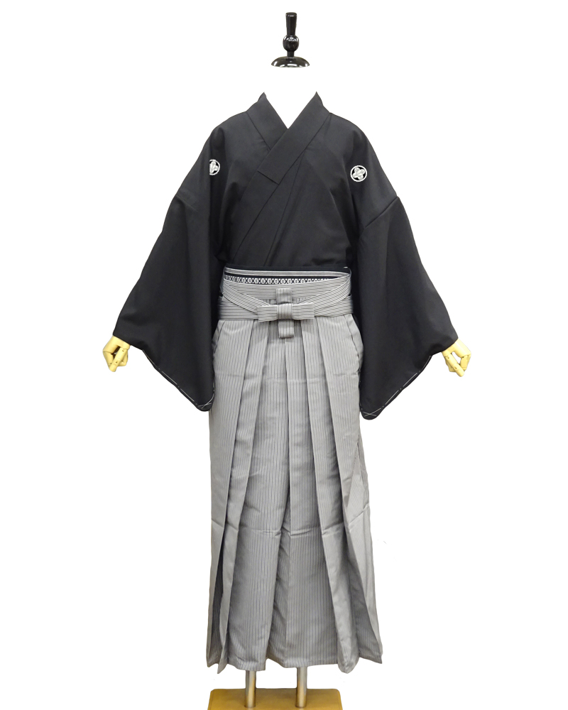 男性着物 | 黒(貼り紋付き)・袴 グレー×黒 縞 紐下87cm