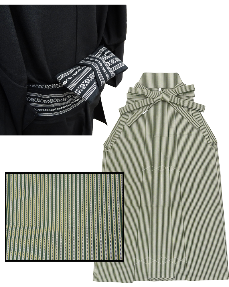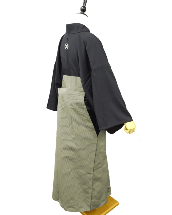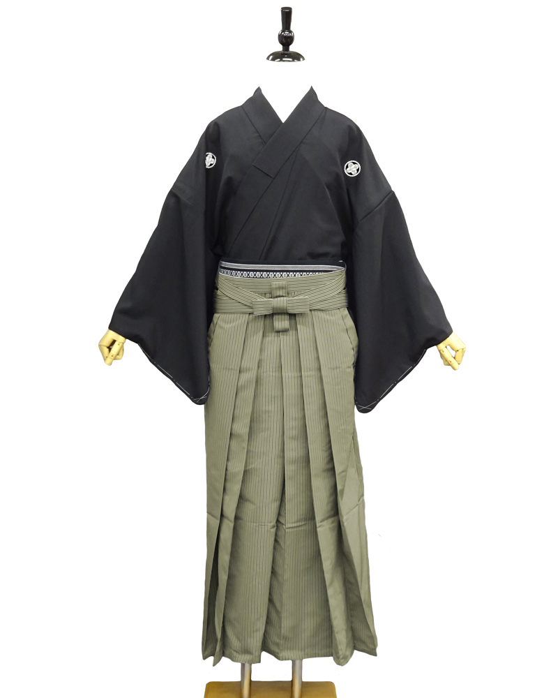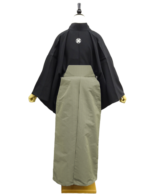 男性着物 | 黒 刷込み紋・袴 グレー×緑 縞 紐下84cm 誂え仕立て