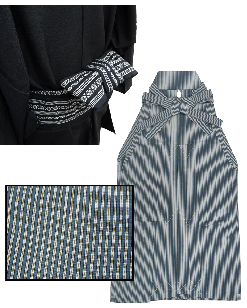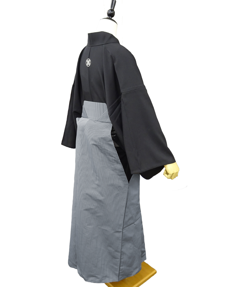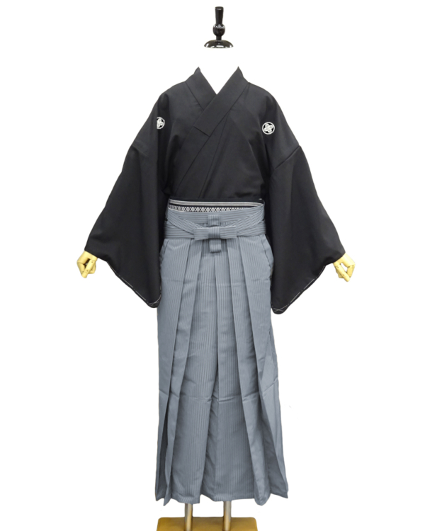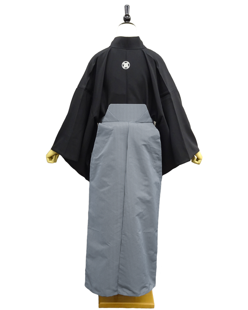 男性着物 | 黒 刷込み紋・袴 薄グレー×青 縞 紐下88cm 誂え仕立て