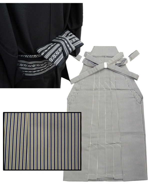 男性着物 | 正絹 黒 染抜き紋 ・袴 紺×黄×白 縞 紐下87cm