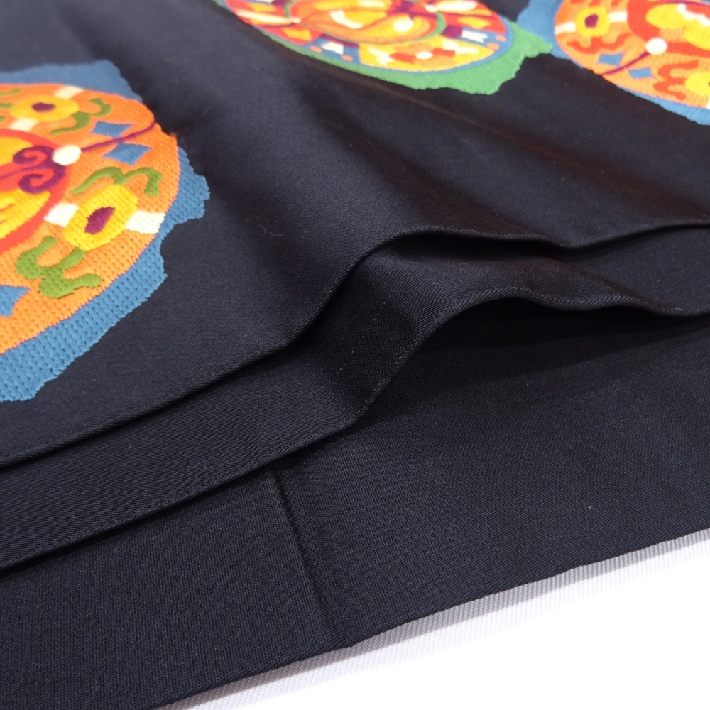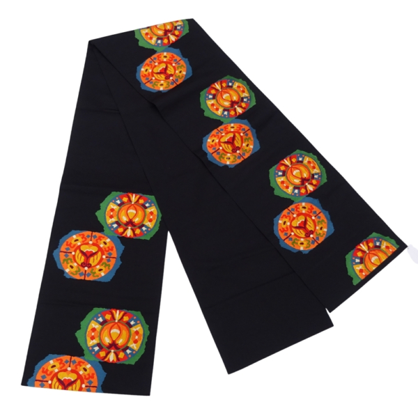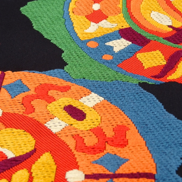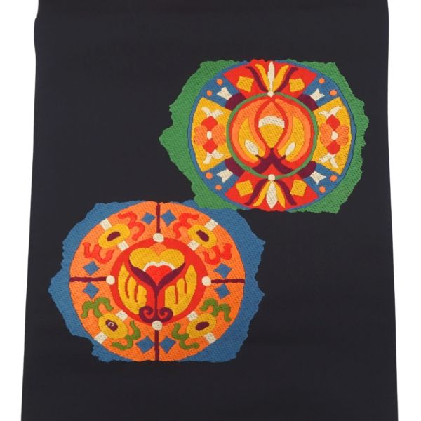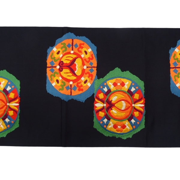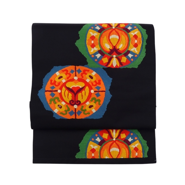 漆黒の地に、オレンジ、イエロー、グリーン、ブルーなど、鮮やかな多色使いの円形文様が大胆に配されたお洒落な本袋帯です。