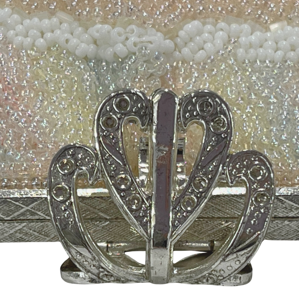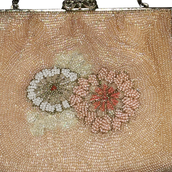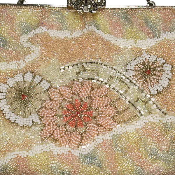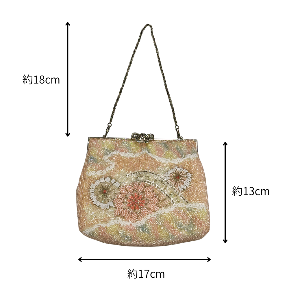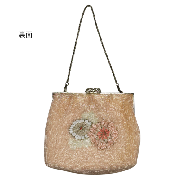 全体に施された繊細なビーズ細工と、中央のパステルカラーの大きな花模様が目を引くデザインです。