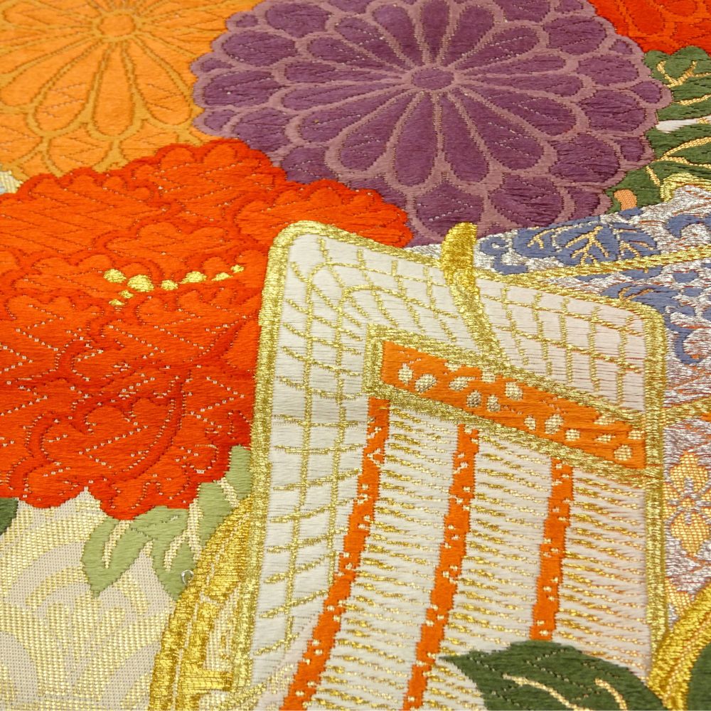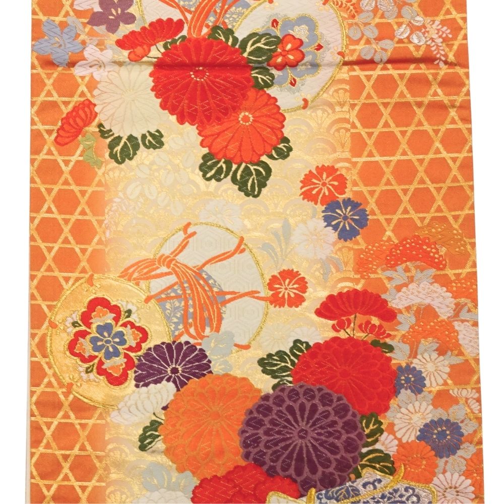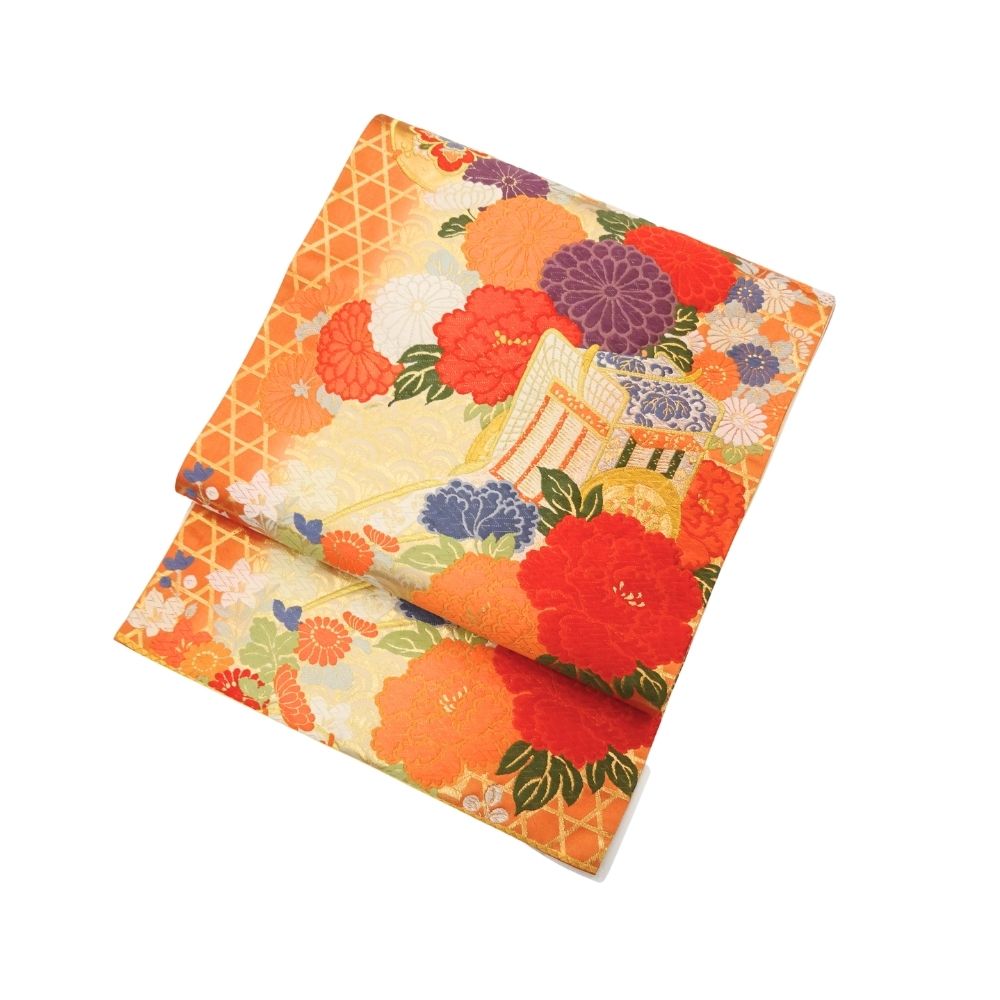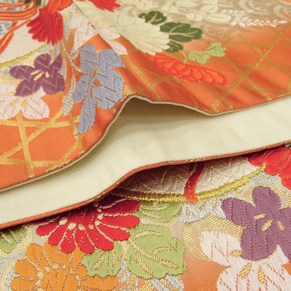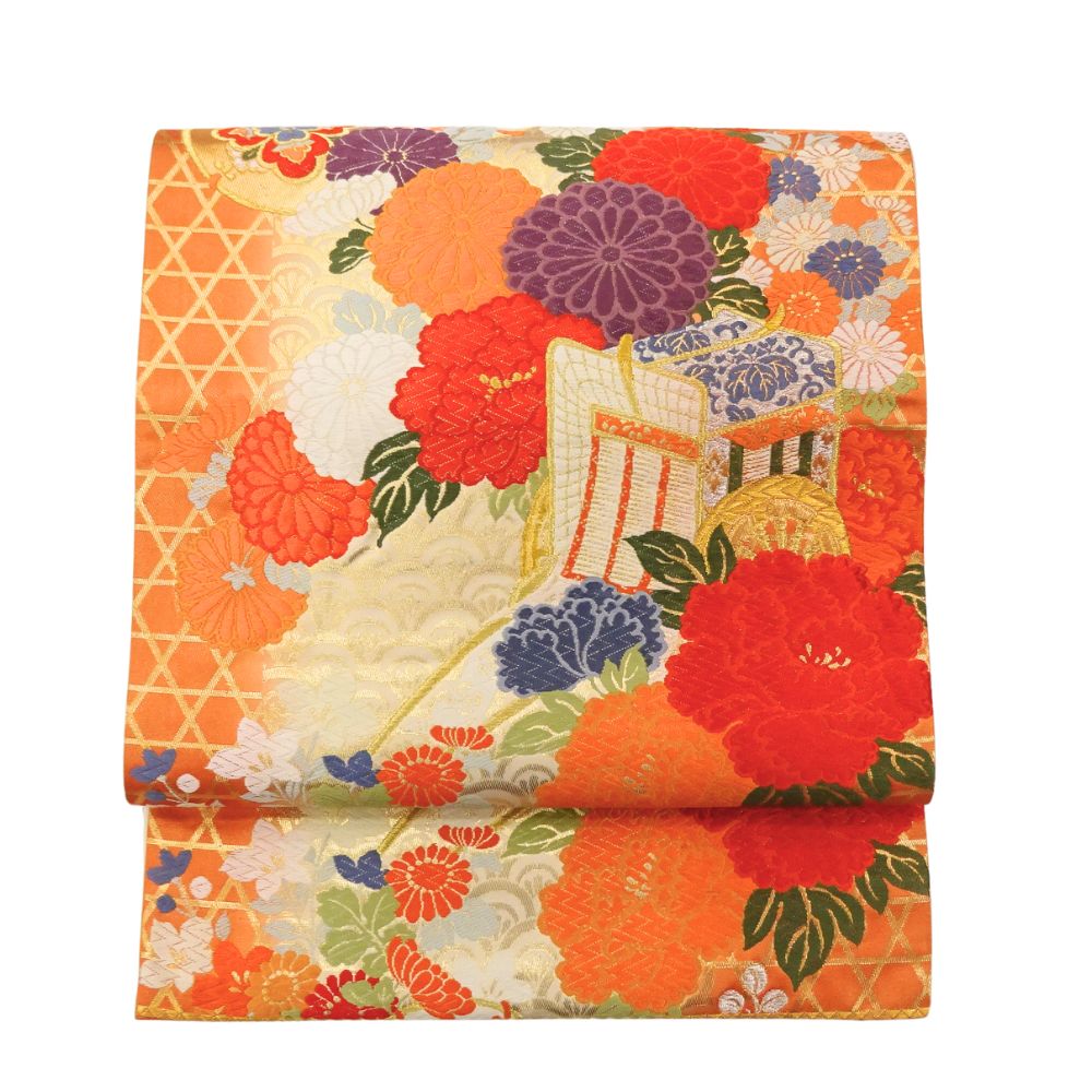 振袖用袋帯 正絹 リユース 中古 金糸 籠目文 御所車に四季花 六通柄 S02-001-2(8050-00603) 礼装 フォーマル 伝統文様 訪問着 付下げ 色無地 小紋