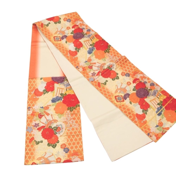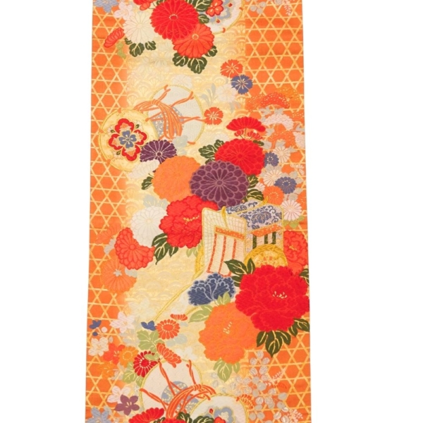 伝統的な籠目模様をベースに、優雅な御所車と四季を彩る牡丹や菊が大胆に配置されており、ハレの日にふさわしい圧倒的な存在感を放ちます。