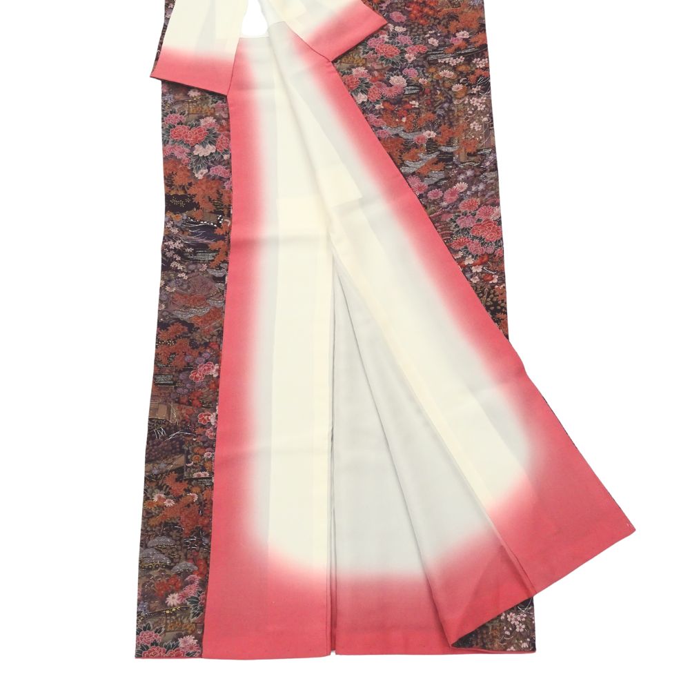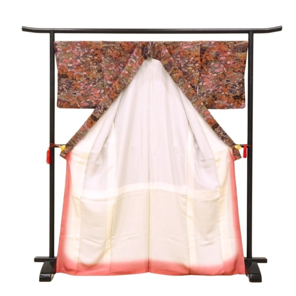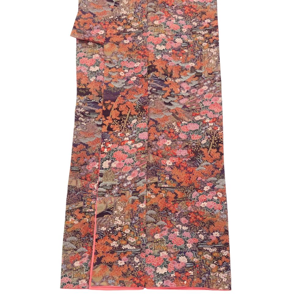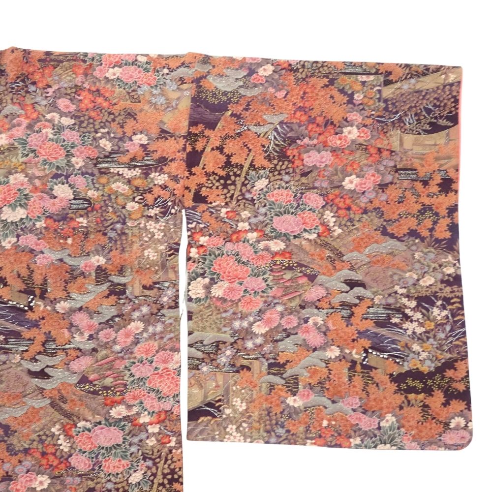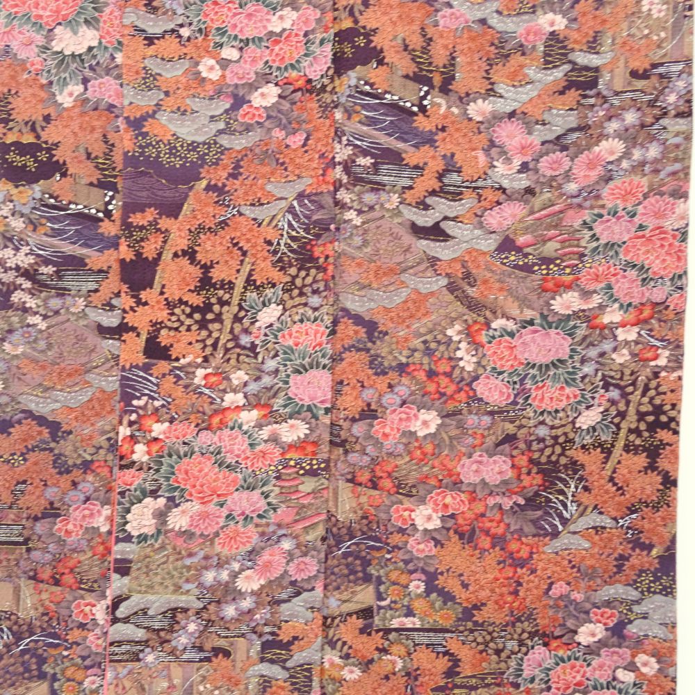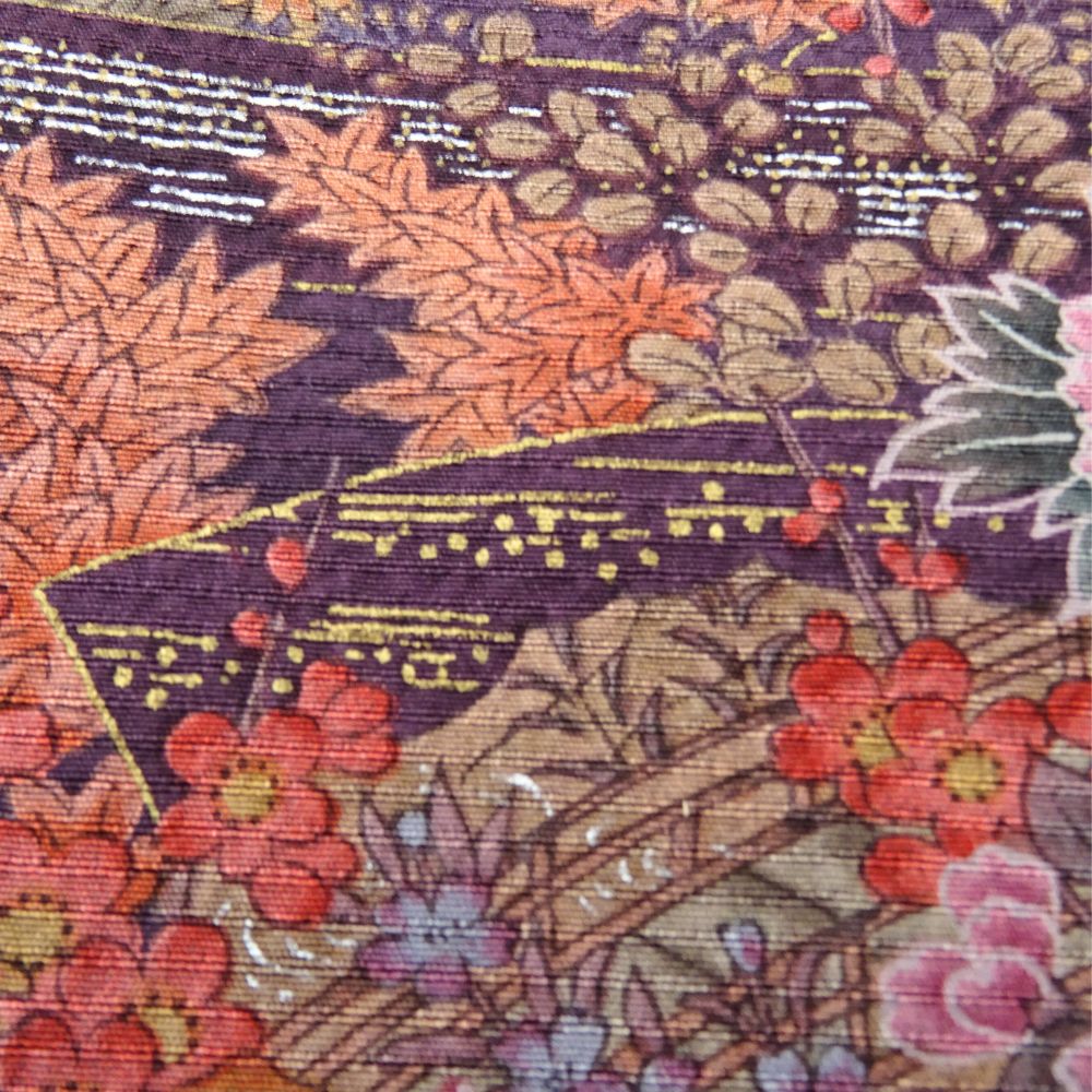 古典的な雲取りの意匠の中に、牡丹、菊、紅葉といった四季折々の植物が密度濃く描かれています。