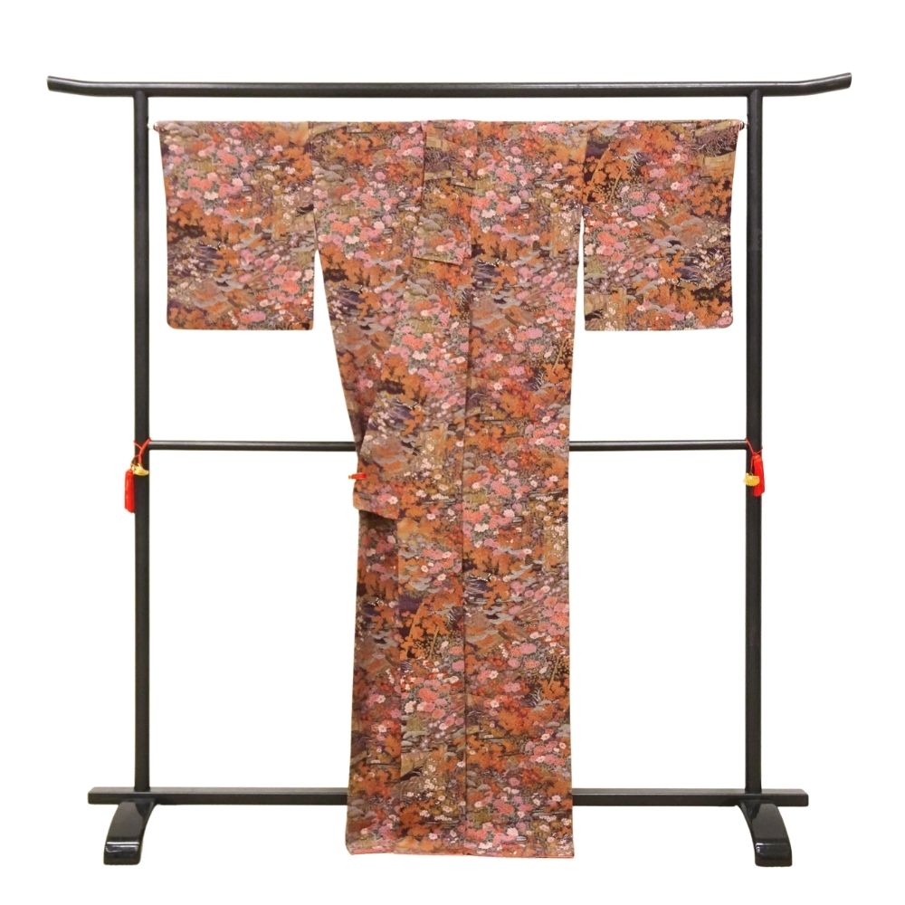 灰みをおびた上品な紫の地に、細やかに描き込まれた四季の草花が咲き誇る、大変美しい小紋です。