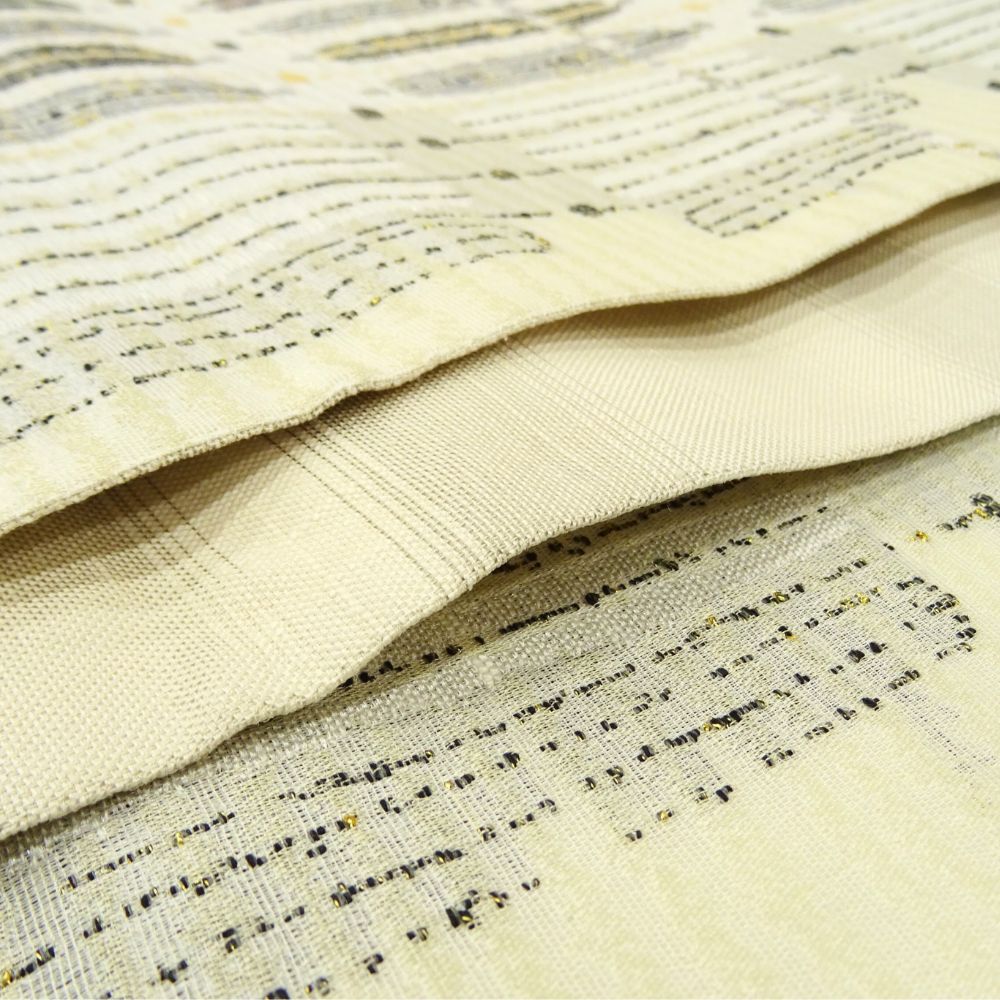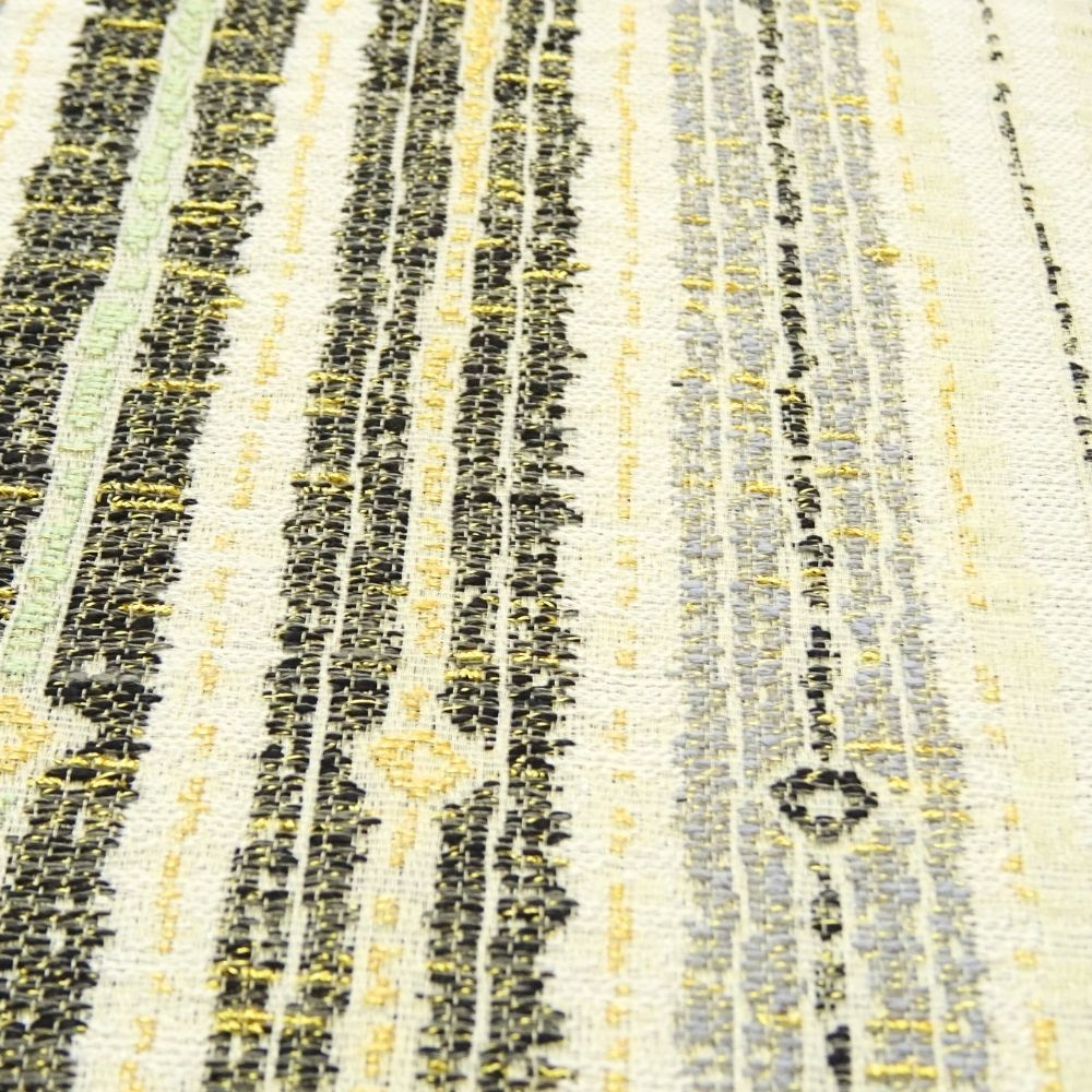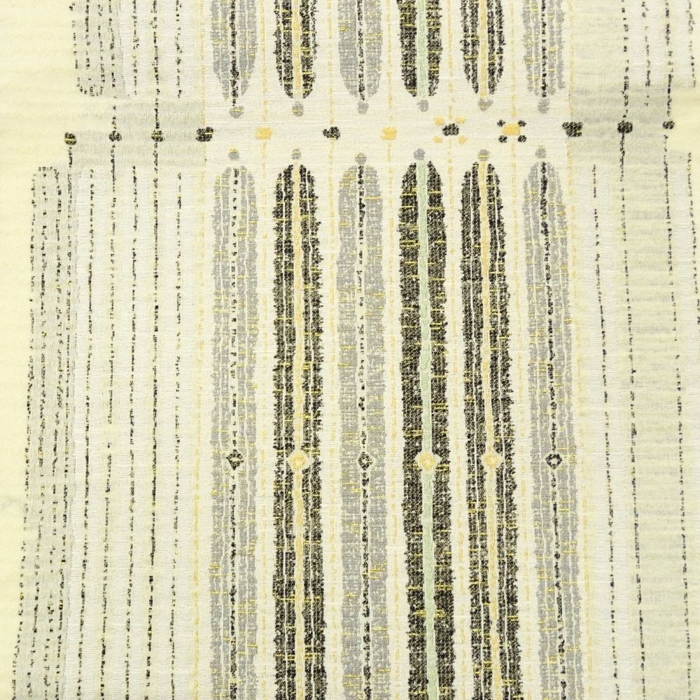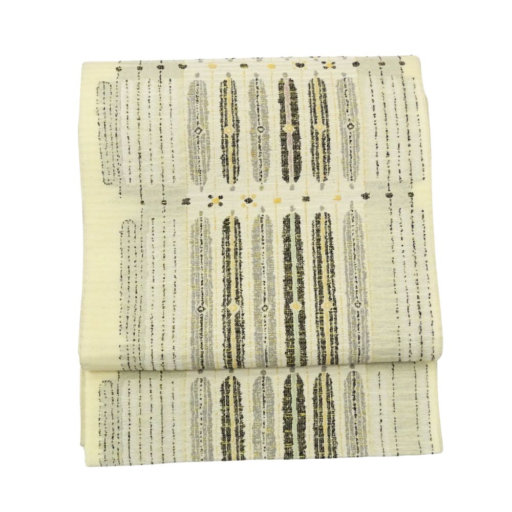 明るいアイボリーをベースに、落ち着いたトーンの色彩で構成された幾何学模様が美しい洒落袋帯です。