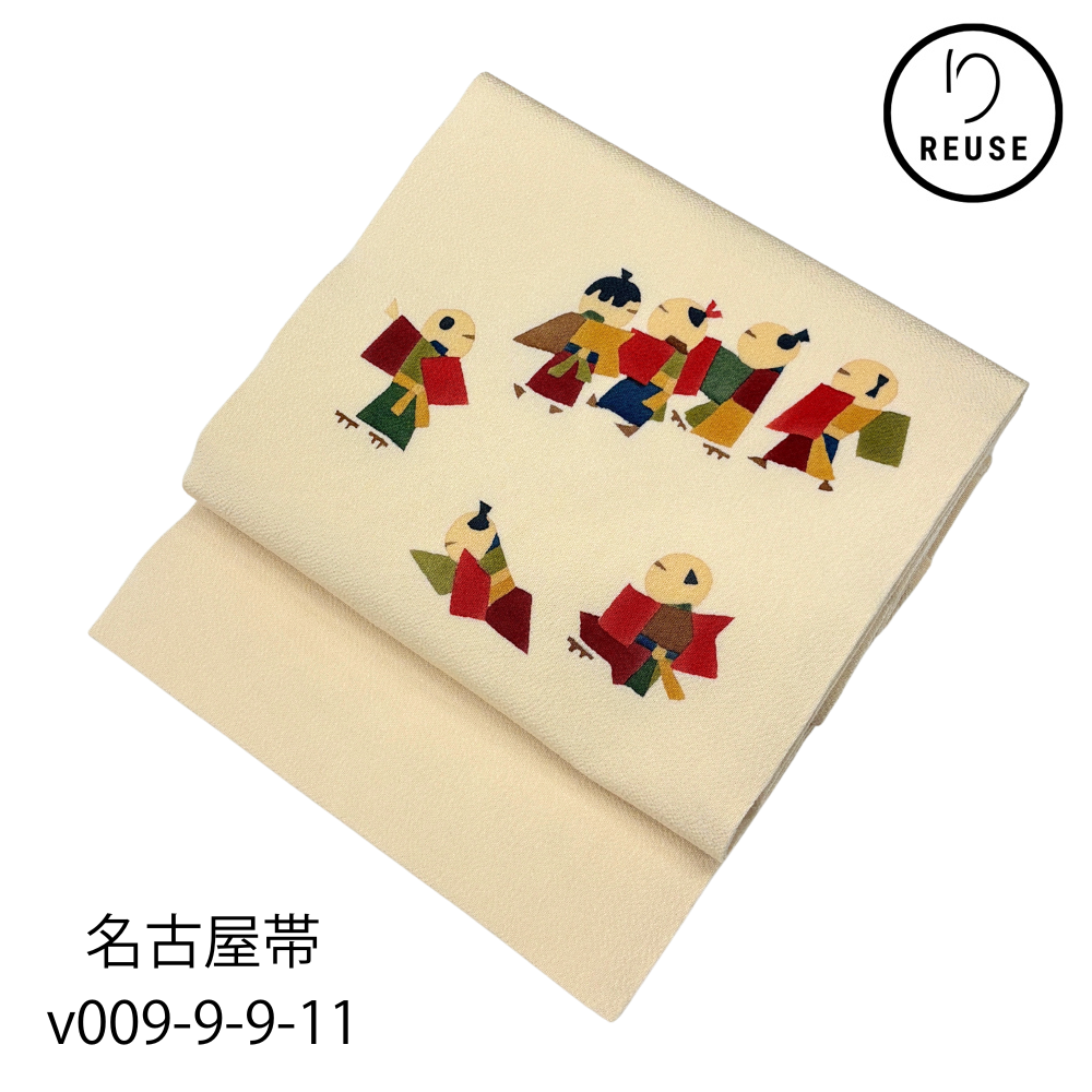 名古屋帯 正絹 リユース 生成り色 ちりめん 遊び童 カジュアル v009-9-9-11