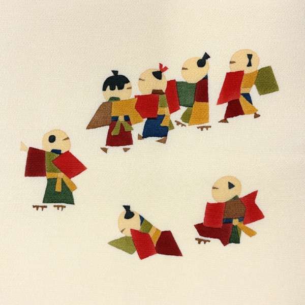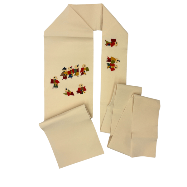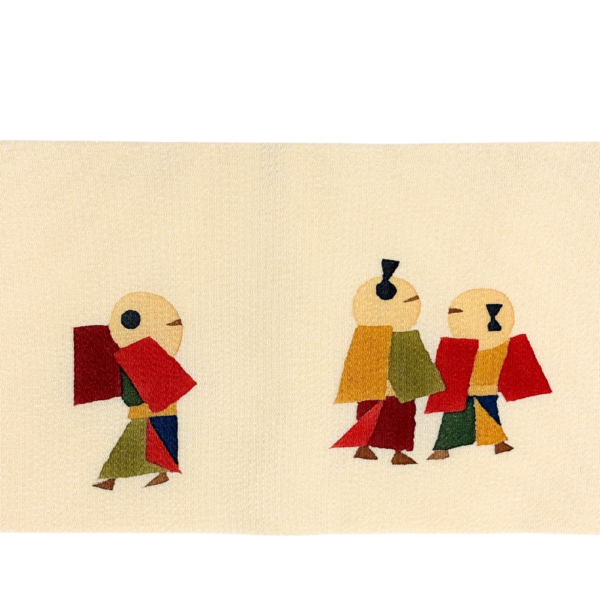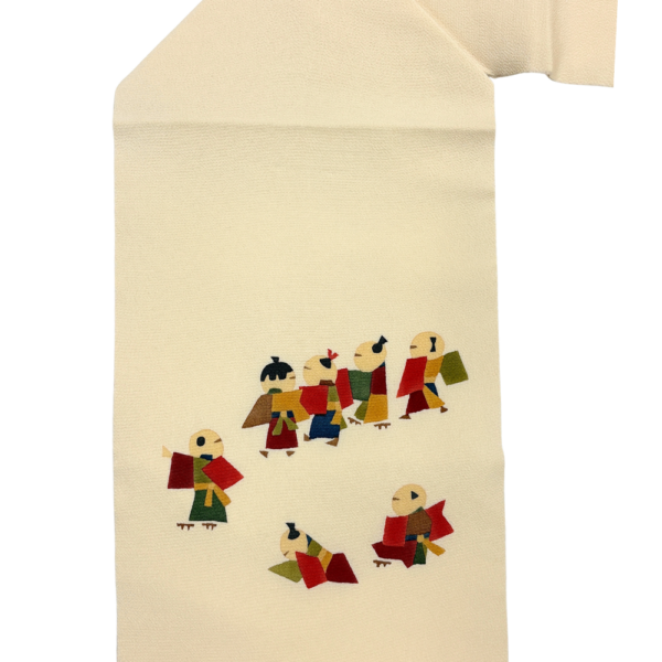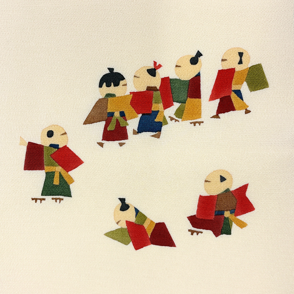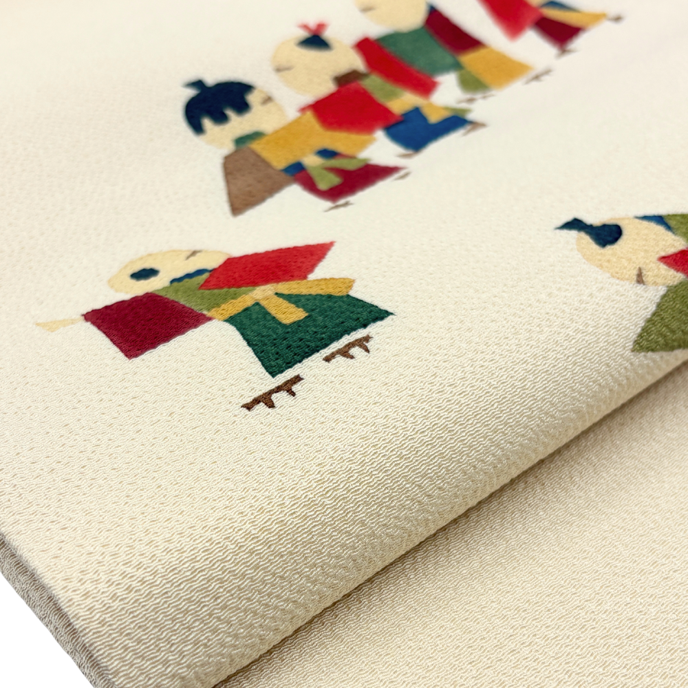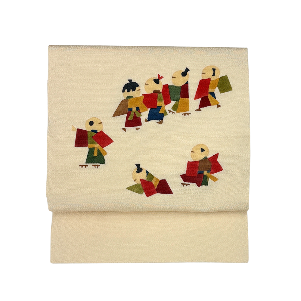 柔らかなアイボリー(生成り色)のちりめん地に、色とりどりの装束を纏った童(わらべ)たちが生き生きと描かれた名古屋帯です。