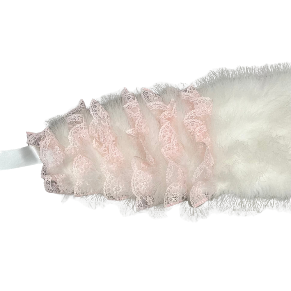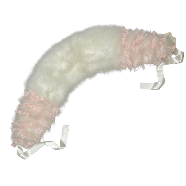 一般的な白一色のショールとは異なり、両端に淡いピンクの段フリルレースがあしらわれた、大変華やかでガーリーなデザインとなっております。