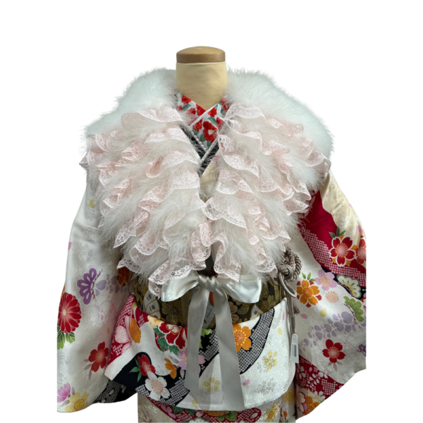 マラボーショール レースフリル付き ピンク×白 振袖用 成人式 卒業式 未使用品 リユース 中古 Y-036 ★